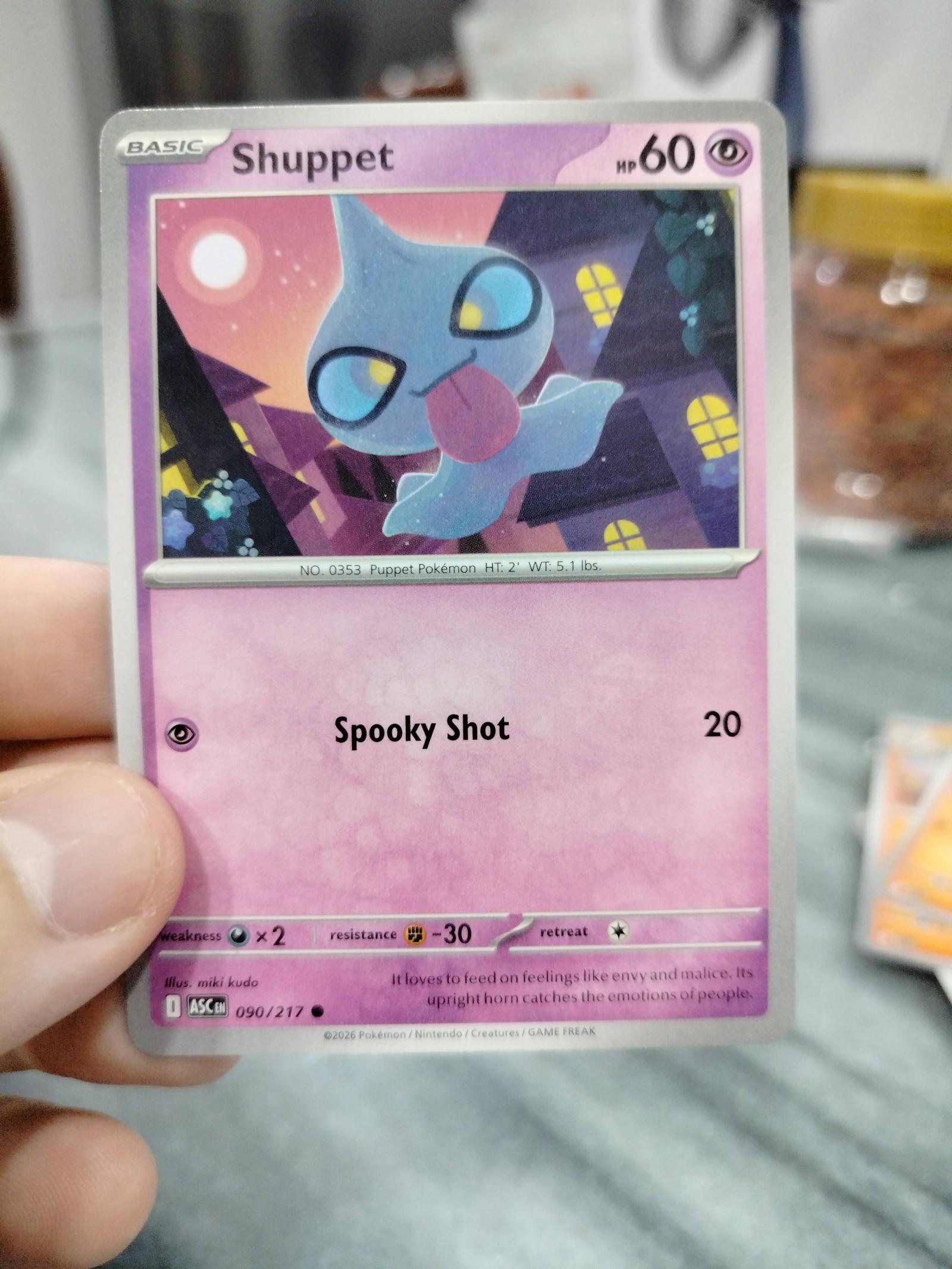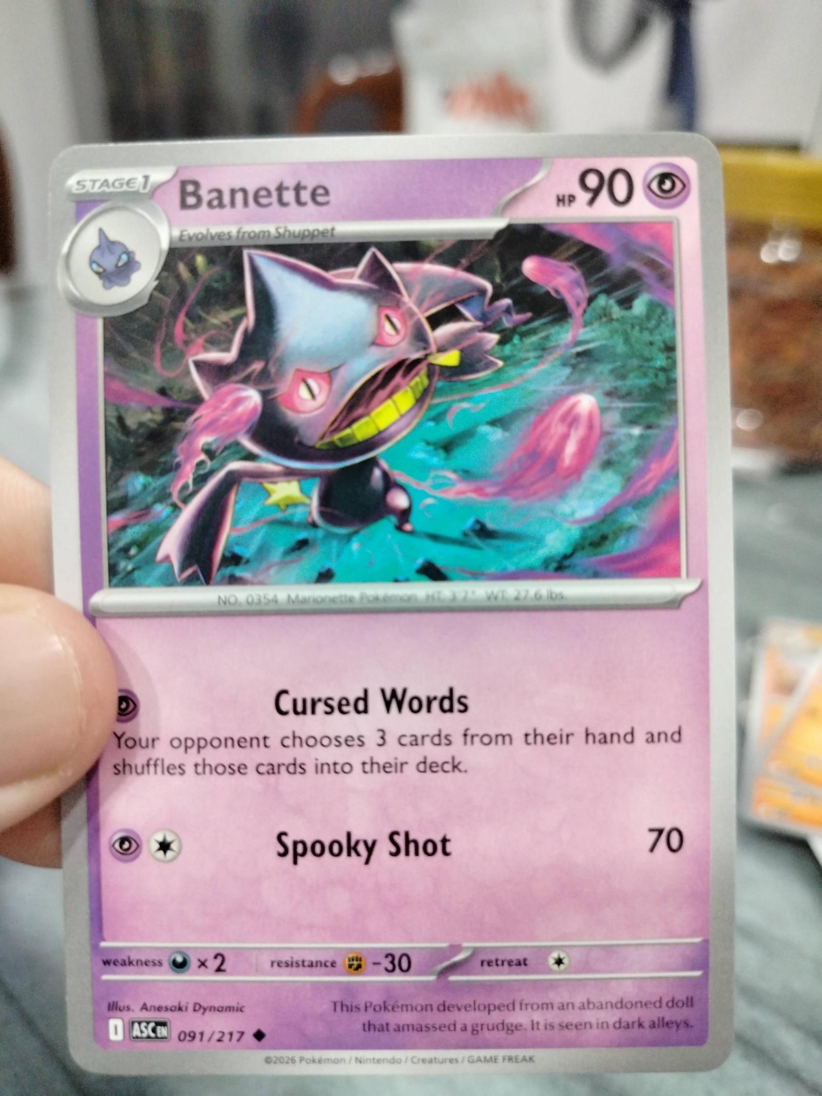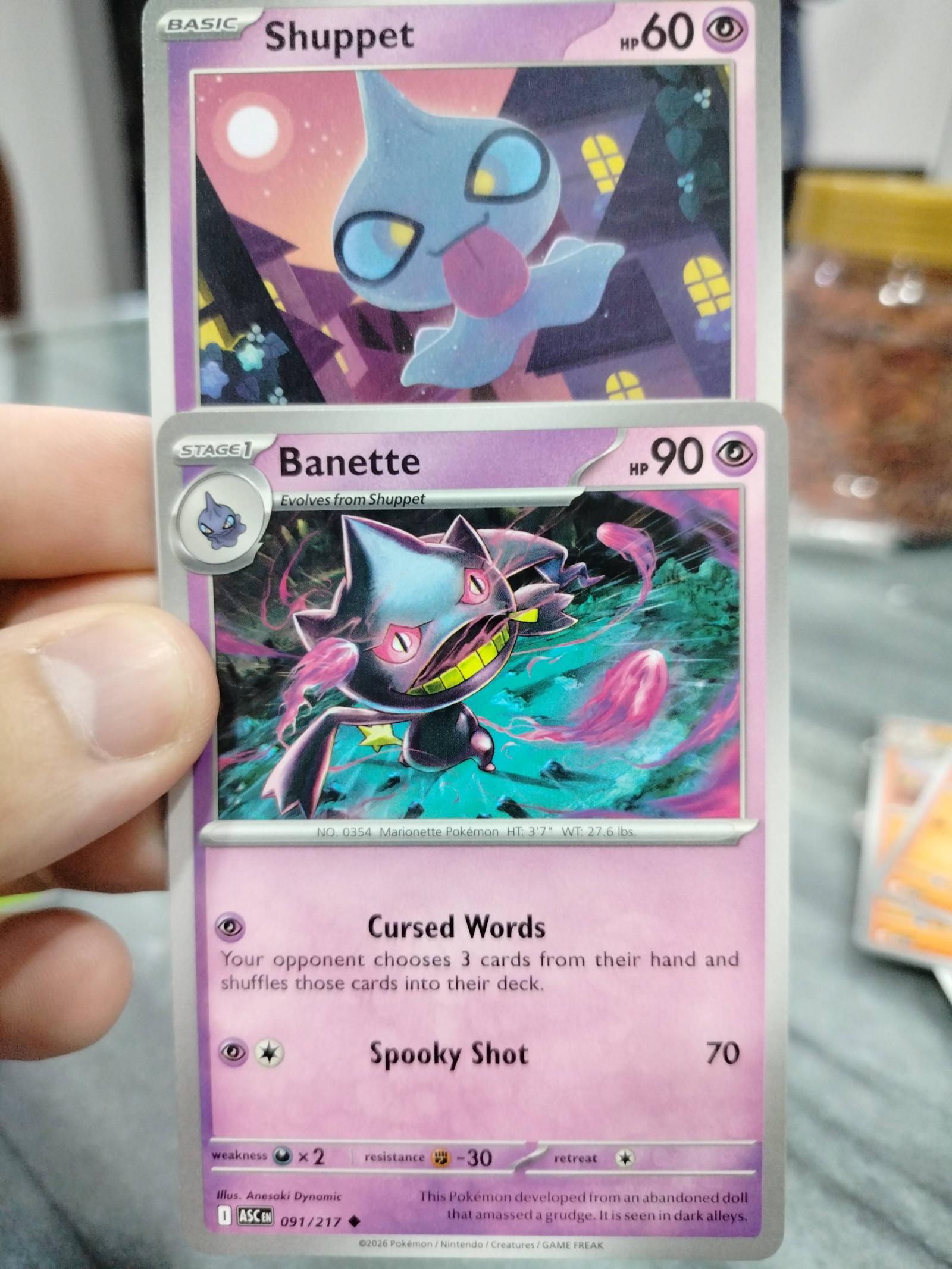Includes two cards from the 2026 Pokemon TCG set Ascending Eclipse: Shuppet (090/217) illustrated by Miki Kudo, and Banette (091/217) illustrated by Anesaki Dynamic. Both cards are in English and feature a normal printing. Shuppet is a Basic Psychic type with 60 HP and the move Spooky Shot. Banette is a Stage 1 Psychic type with 90 HP and moves Cursed Words and Spooky Shot. These cards are playable in the current meta and are collectible for fans of the Ascending Eclipse set. Neither card is foil or special printing treatment.