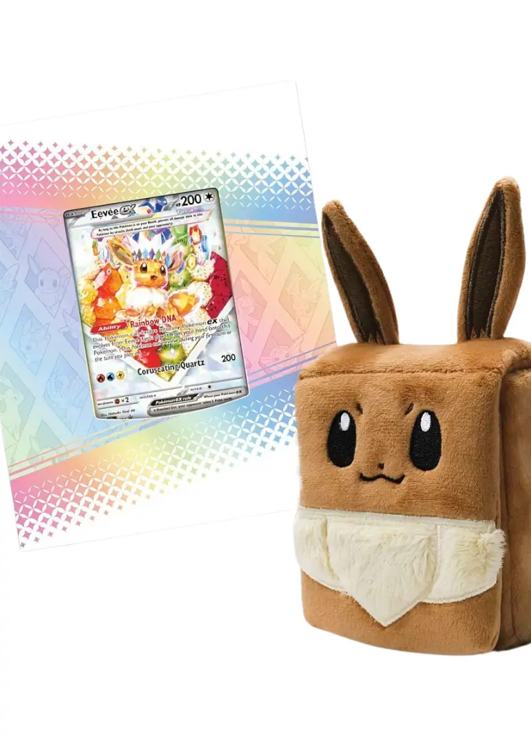Eevee & Friends Make a Rainbow of Fun! Eevee and its Evolutions spread friendship and joy everywhere they go, and with the adorable accessories in this collection, they’re sure to bring that same happiness to your next big game! Inside, you’ll find a special illustration rare-style promo card featuring Eevee as a Stellar Tera Pokémon ex, ready to evolve thanks to its Rainbow DNA. You also get a fuzzy Eevee deck box, a playmat and full set of card sleeves featuring amazing artwork of Eevee and its Evolutions, and more than a dozen booster packs from the special Scarlet & Violet—Prismatic Evolutions expansion.