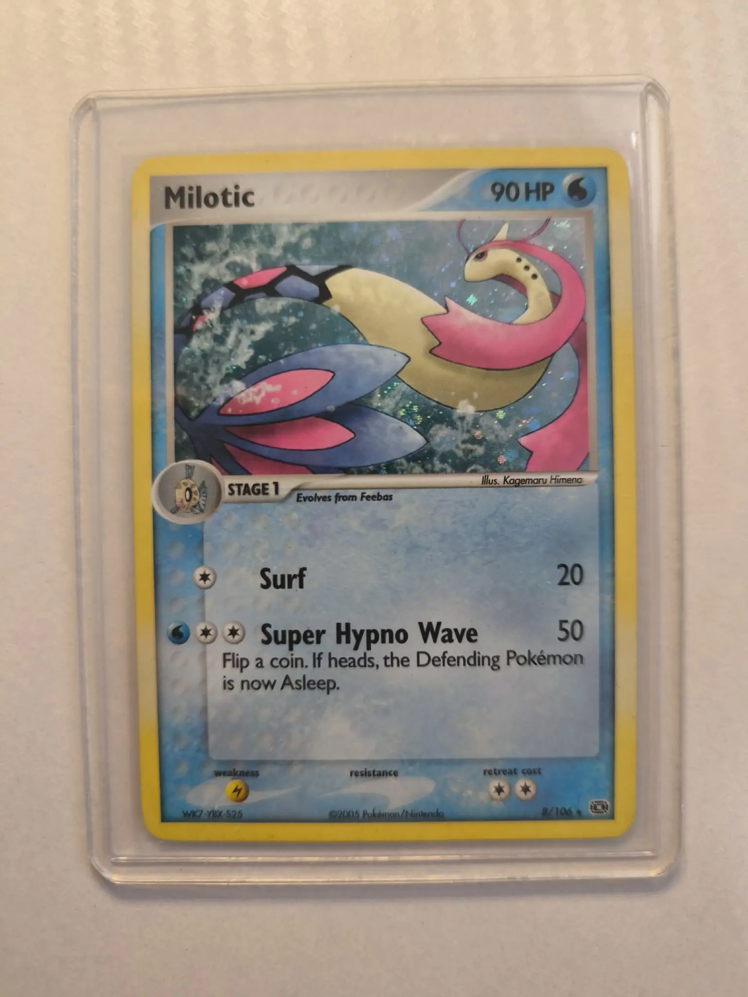 Up for sale is the stunning Milotic 8/106 Holo Rare from the iconic 2005 EX Emerald expansion. Known as the most beautiful Pokémon in the Hoenn region, this card features the legendary artwork of Kagemaru Himeno.