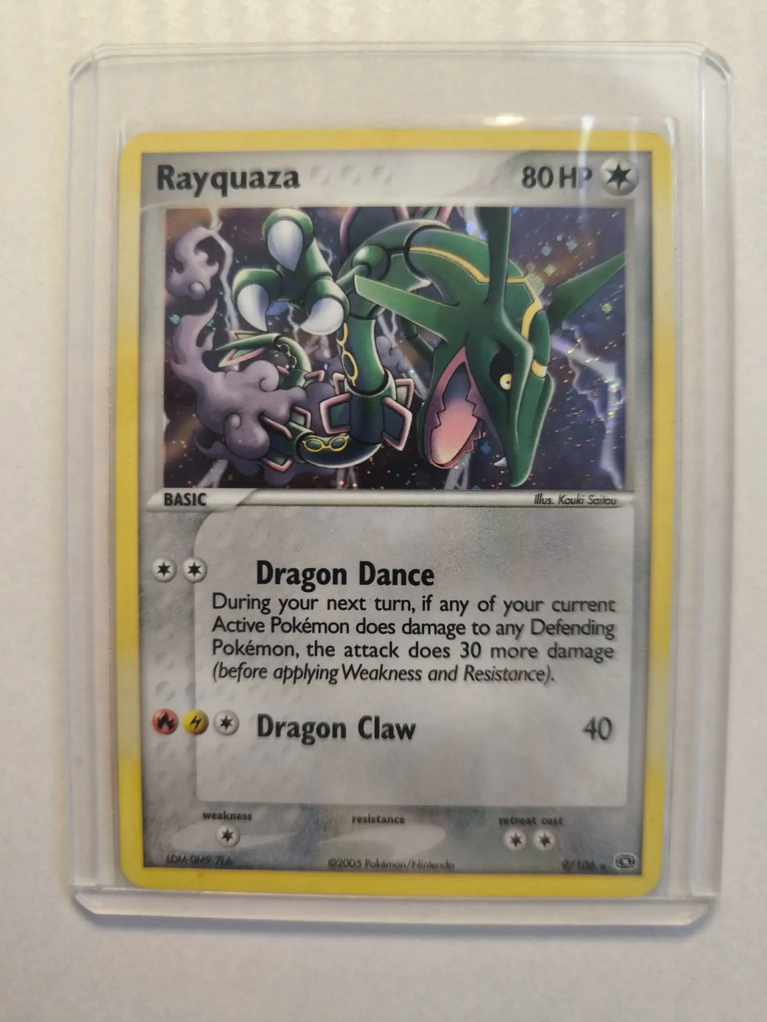 The highly sought-after Rayquaza 9/106 Holo Rare from the critically acclaimed 2005 EX Emerald expansion. Rayquaza is one of the most popular and powerful Dragon-type Pokémon of all time, and this classic representation is a cornerstone card for any serious collector of the "golden era" of the Pokémon TCG.
