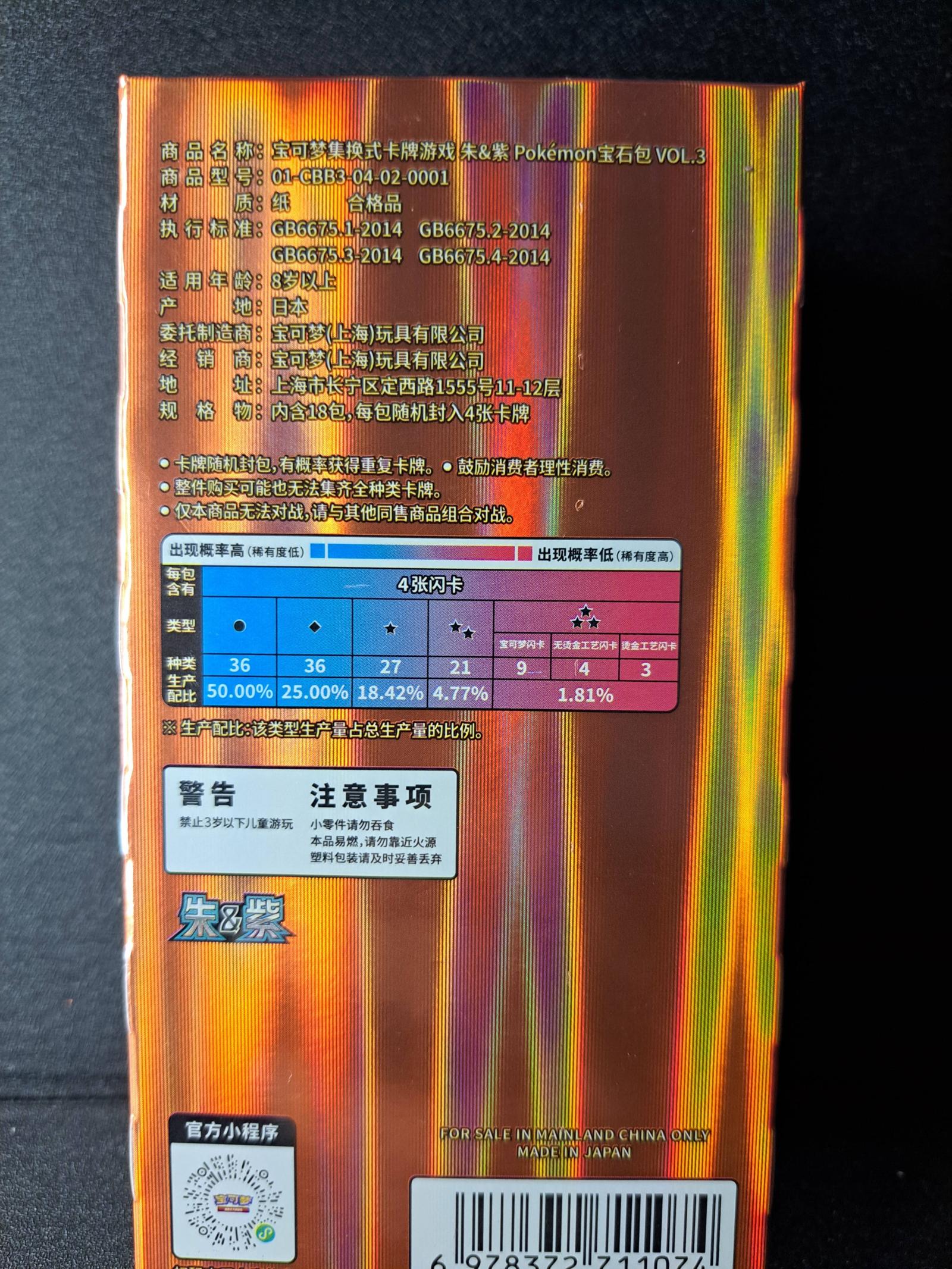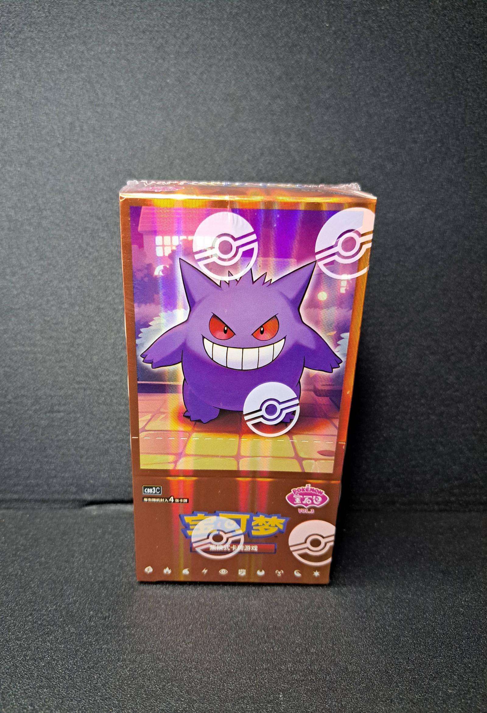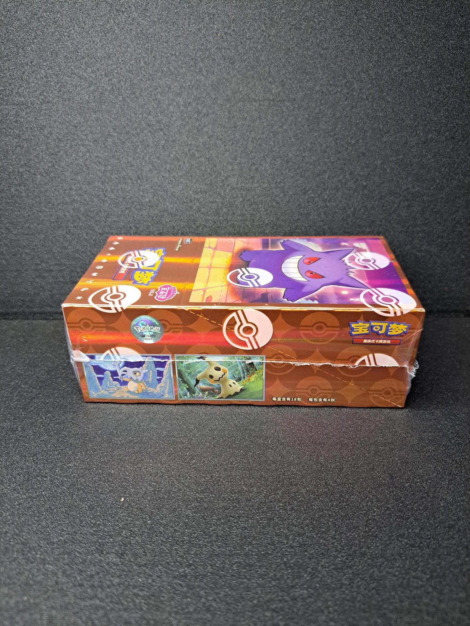 This is a sealed booster box from the Pokemon Zhu & Zi set Vol.3 featuring Gengar on the packaging. The box contains 18 packs, each with 4 random cards. Manufactured in Japan and intended for sale in Mainland China. The set includes various foil cards with different rarity rates. This product is mainly collectible rather than meta-playable. No specific card number or artist information is available on the packaging.