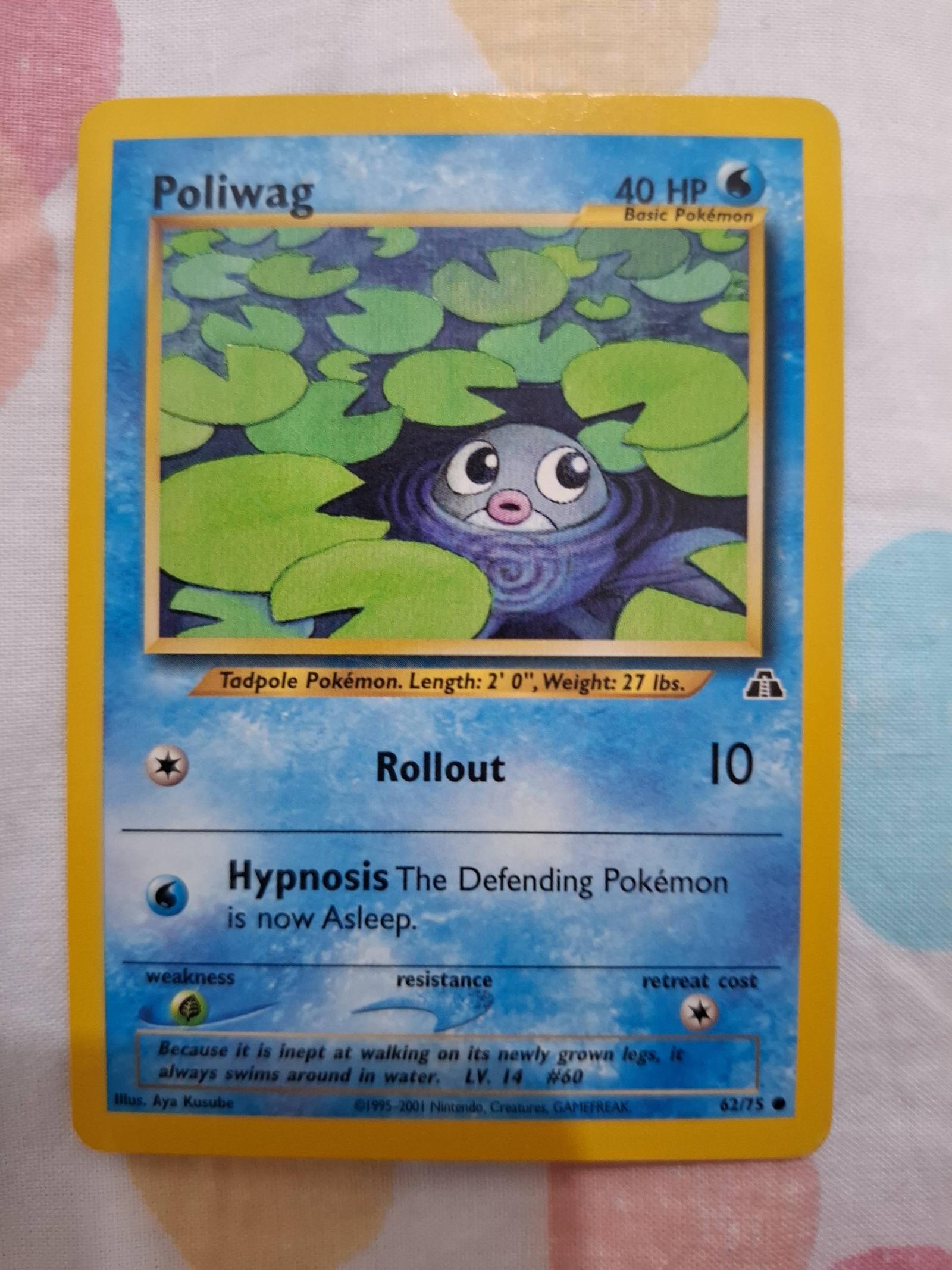Poliwag card from the Neo Genesis set, card number 62 out of 75. Illustrated by Aya Kusube and printed in 2001 by Nintendo, Creatures, GAMEFREAK. This is a basic Water-type Pokémon with 40 HP, featuring attacks Rollout and Hypnosis. The card is non-foil and is mostly collectible, as Poliwag is not commonly seen in competitive meta decks.