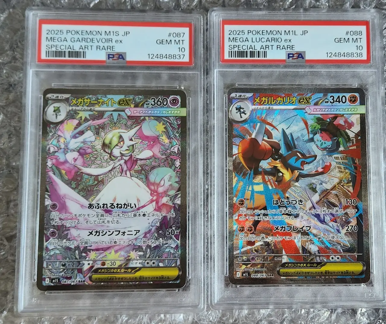 Notable Features & Collectible Value: These are sequentially numbered PSA slabs, which adds premium appeal for matched-pair collectors and display-oriented builds. The SAR full-art treatment delivers high visual impact — textured holo, vibrant colors and detailed illustrations that are highly sought after by fans of full-art aesthetics. Both Mega ex Pokémon are popular subjects and attract interest from Japanese collectors and international full-art enthusiasts. These cards are primarily collectible/display pieces rather than tournament staples.