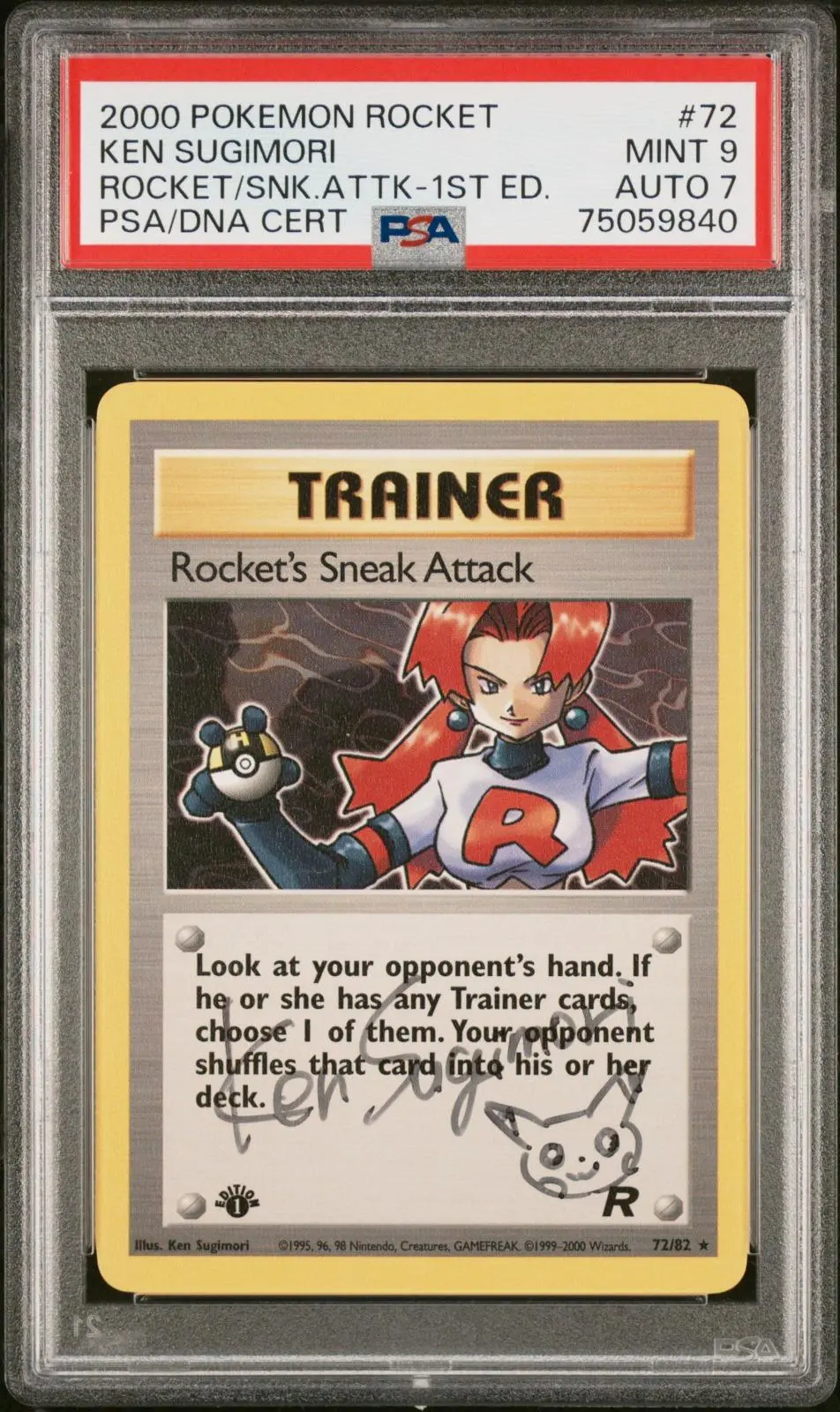 This is a Rocket's Sneak Attack, illustrated and signed by Ken Sugimori. Graded PSA9 Auto 7 by PSA.