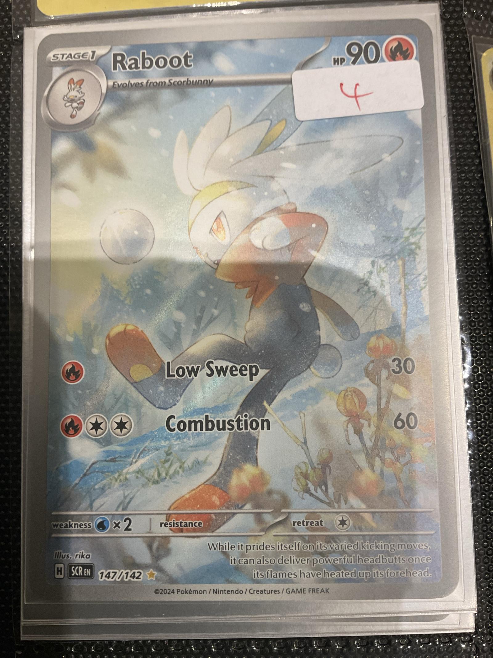 Raboot card from the Sword & Shield set, card number 147/142, illustrated by rika. This is a secret rare foil card printed in English, featuring a full-art treatment. The card is playable in the current meta and showcases Raboot evolving from Scorbunny with attacks Low Sweep and Combustion.