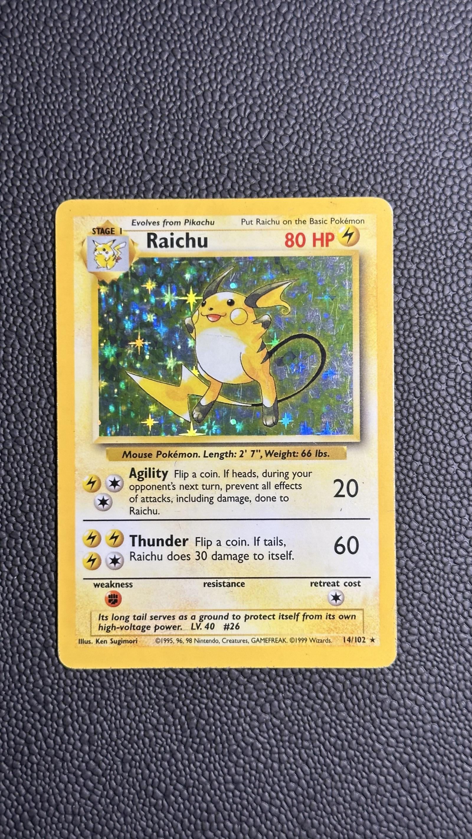 Raichu card from the 1999 Base Set Unlimited (14/102) illustrated by Ken Sugimori. This English version holo card features 80 HP and moves Agility and Thunder. A classic collectible from the original Pokemon TCG set, highly sought after by collectors. Card is foil (holo). Damage during shipping is at your own risk and no refunds !