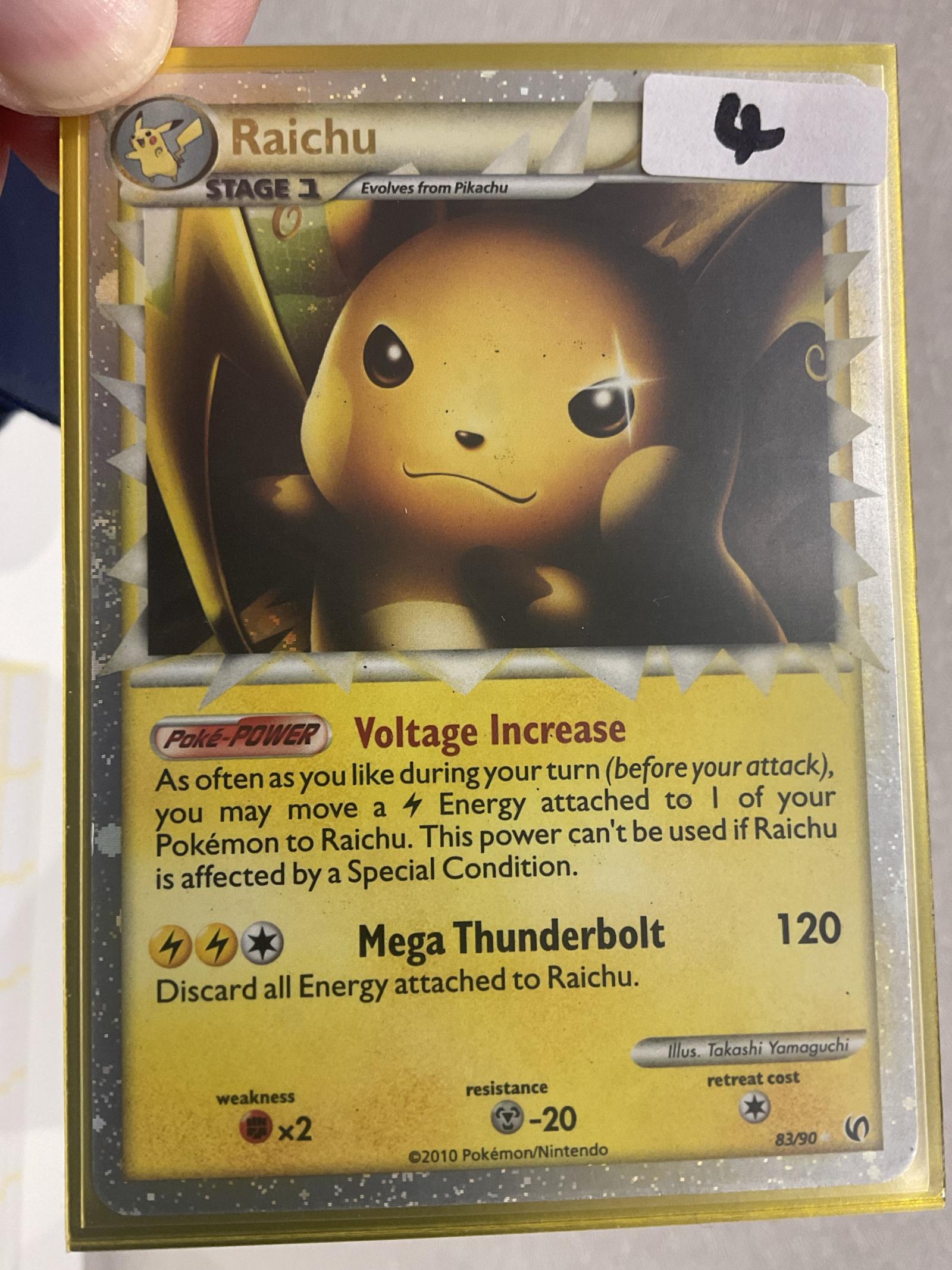 Raichu holographic rare card from the HeartGold & SoulSilver Base Set (2010). Card number 83/90. Illustrated by Takashi Yamaguchi. Playable in the meta for its Voltage Increase Poké-Power and Mega Thunderbolt attack. Foil/holo finish.