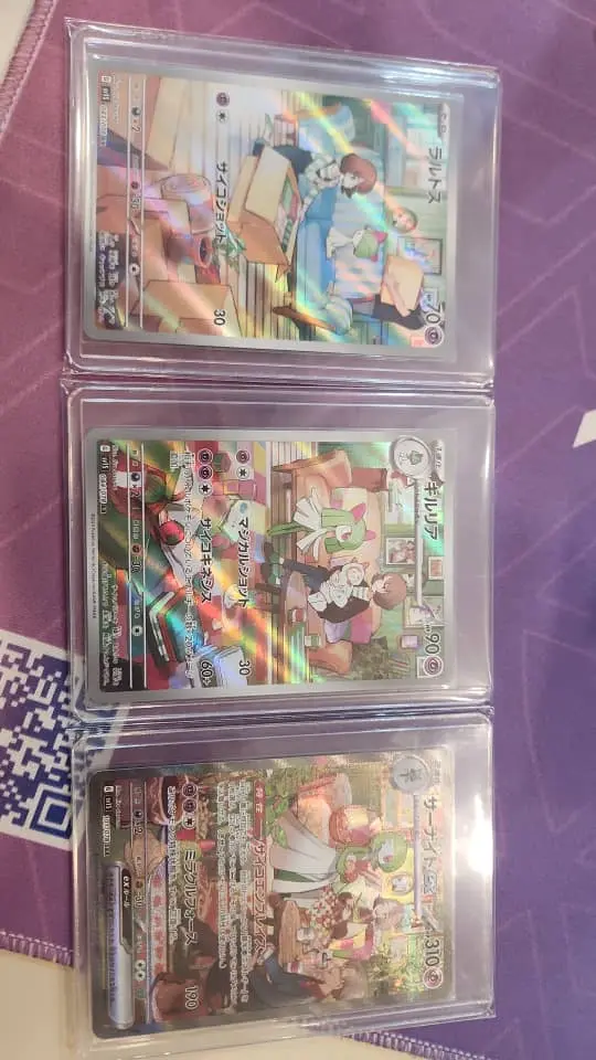 - Japanese text full‑art illustrations with rainbow holo foil across the fronts — visually striking collector pieces. The trio depicts Ralts, Kirlia and Gardevoir in a shared art style/scene, which makes this an attractive matched set for display or completing a collection.
