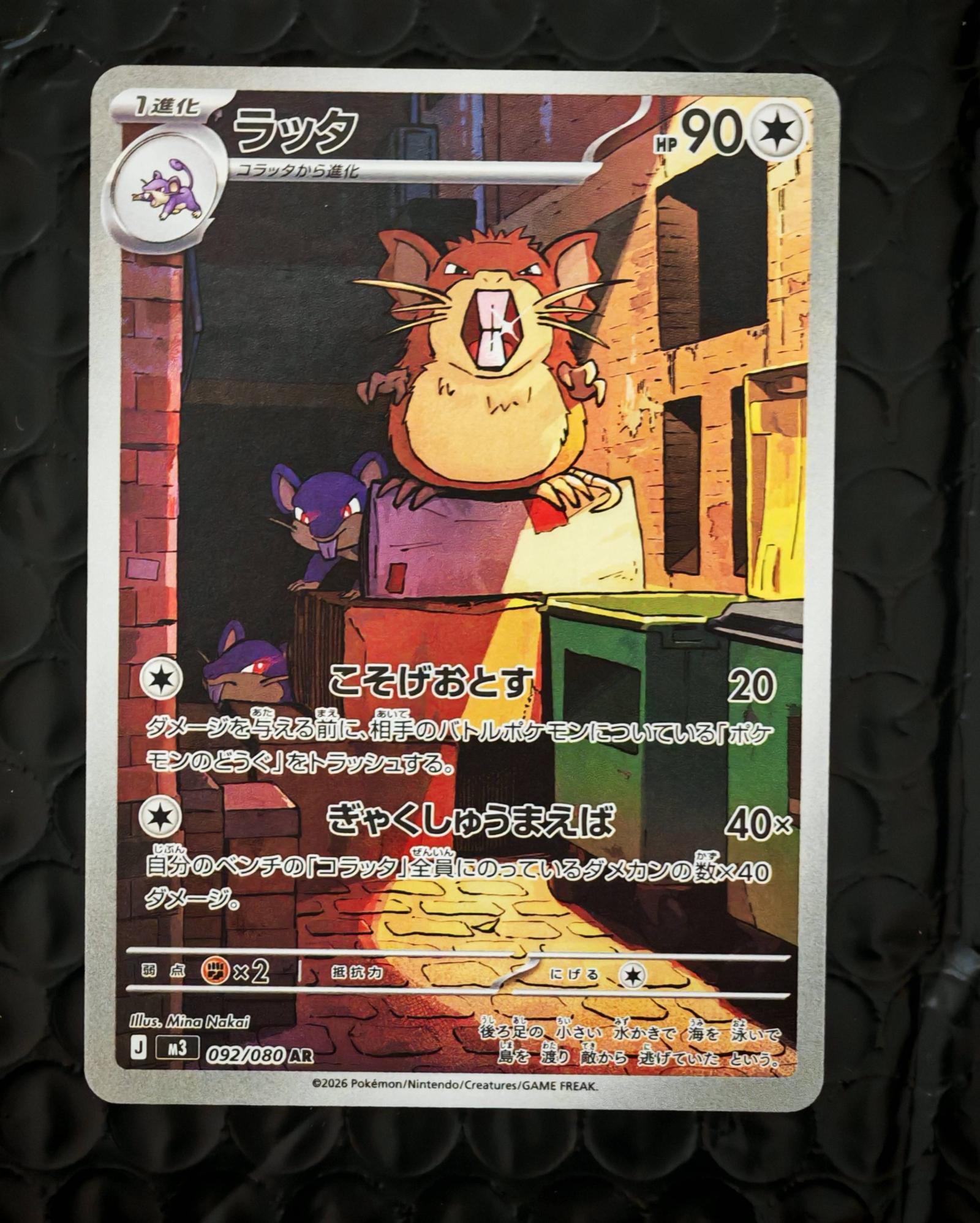 Raticate (ラッタ), card number 92/080 from a Pokemon TCG set, illustrated by Mina Nakai. Japanese language card featuring a unique artwork of Raticate in an alley scene. This card is an alternate rare (AR) and appears to have foil treatment. Playability varies depending on the specific set format, generally more collectible due to alternate art and rarity.