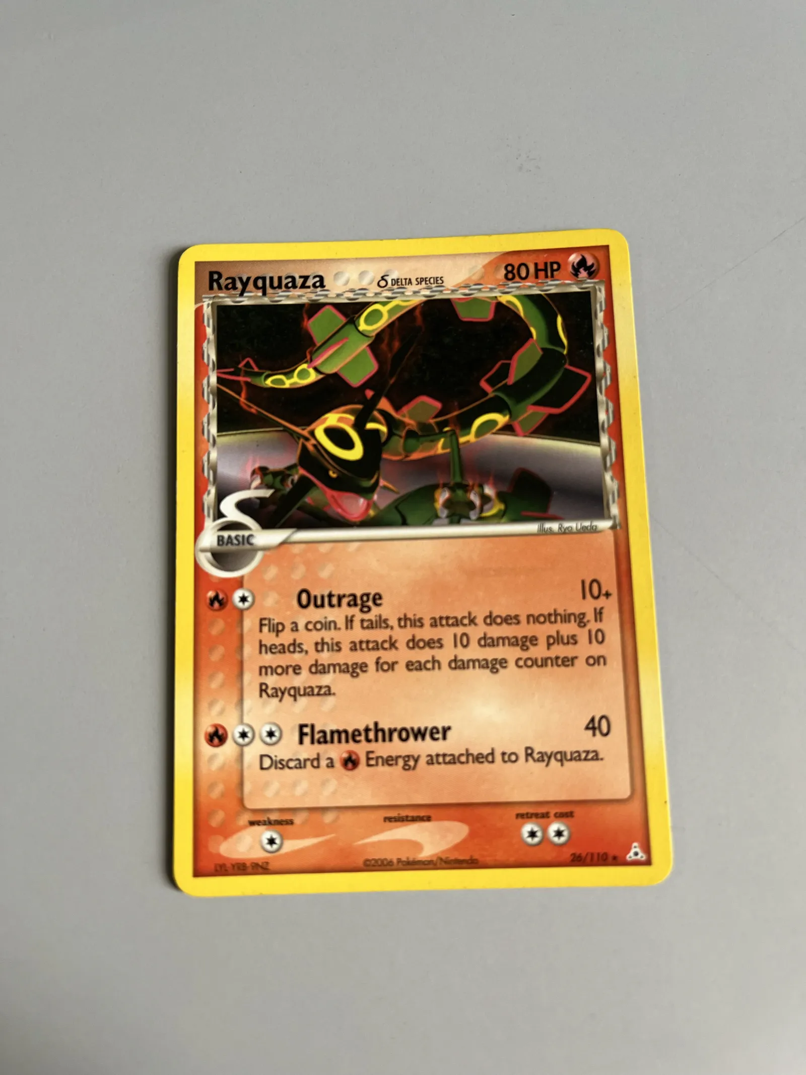 Rayquaza, a pokemon who is a rare and unique version of the legendary in the Holon Phantoms delta species. Its design shows a unique design and matte style.