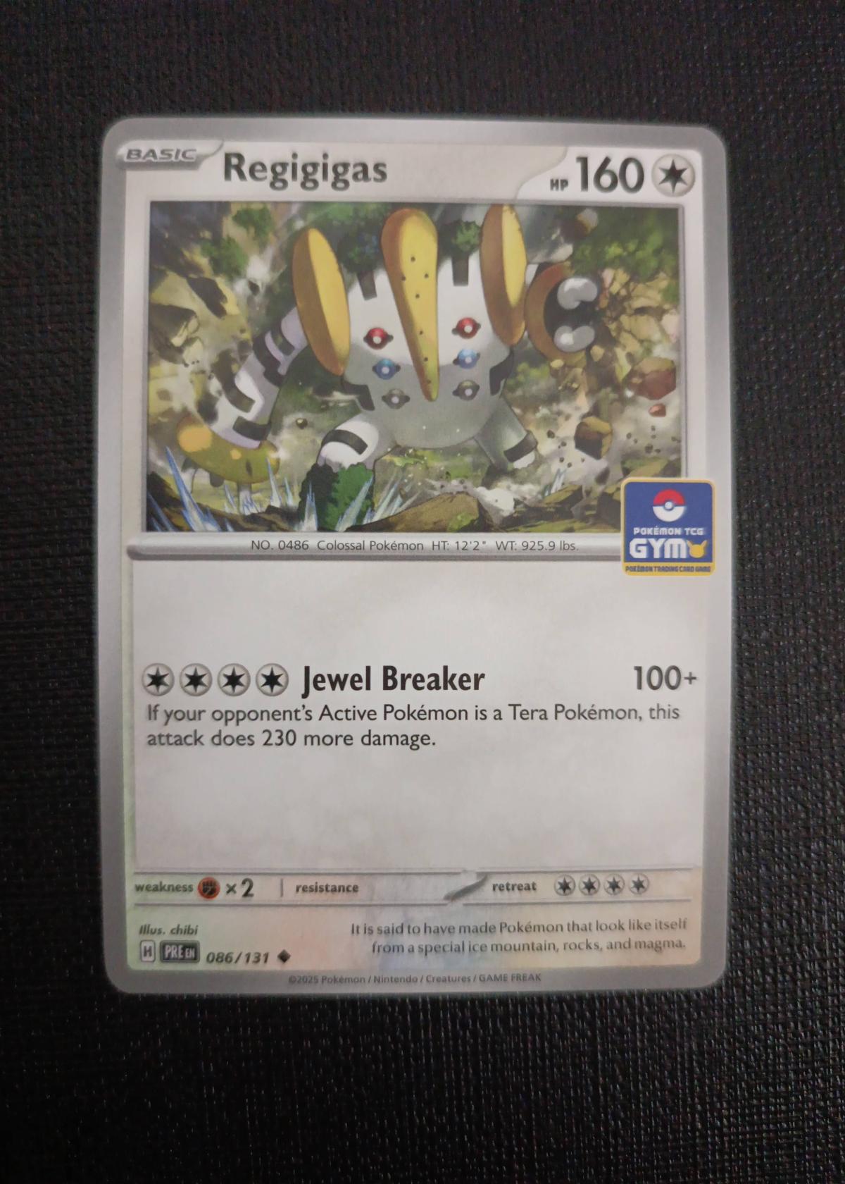 Regigigas - 086/131 from the Pokémon TCG set Paldean Fates (PRE). The card features art by chibi and has a Gym promo stamp, making it a collectible item. The 6-digit Pokémon number for this card is 0486. It has 160 HP and features the 'Jewel Breaker' attack, which can deal significant extra damage against Tera Pokémon. This card is primarily collectible rather than competitive, owing to its promo status and unique stamp. The card is non-foil.