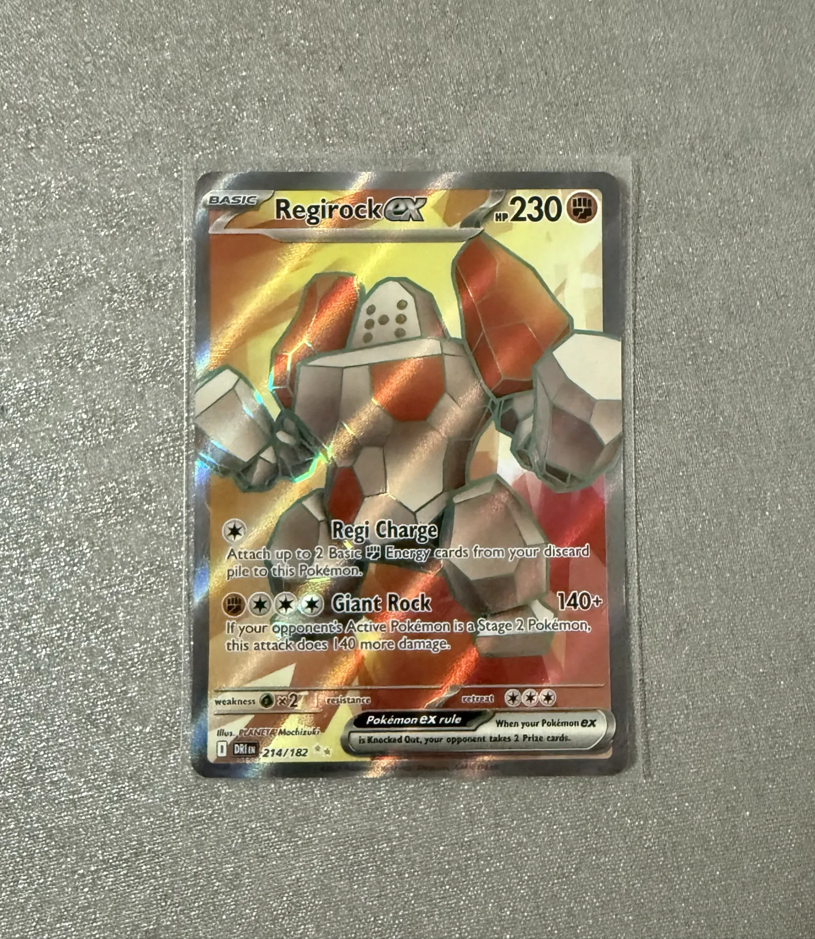 Regirock ex card number 214/182 from the Destined Rivals set. Artist: PLANETA Mochizuki. This is a holo rare card featuring the powerful Regirock ex with 230 HP. The card is foil and has the Pokemon-ex rule which makes it sought after both for collectors and some casual players, though not typically meta playable. Language code is English. The card is in excellent condition as shown in the images.