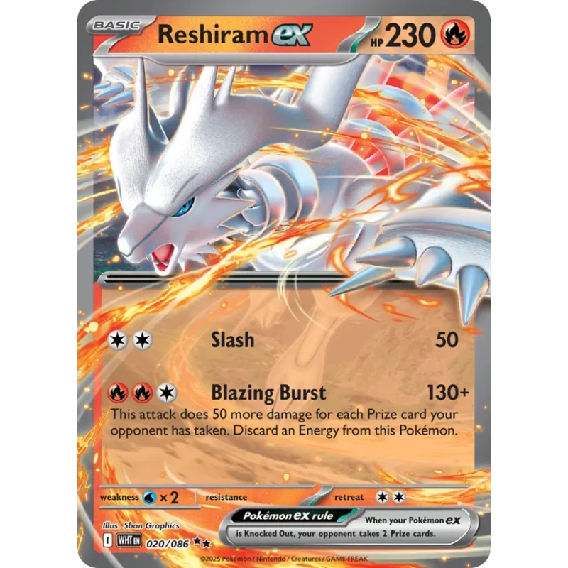 This is a Reshiram EX holofoil card from the White Flare set. Card number 020/086. Features artwork by 5ban Graphics. The card is in English and has a foil holographic treatment. It has 230 HP and Fire type with attacks Slash and Blazing Burst. This card is collectible but also playable in some casual formats, not currently meta-dominant. No grading information available.
