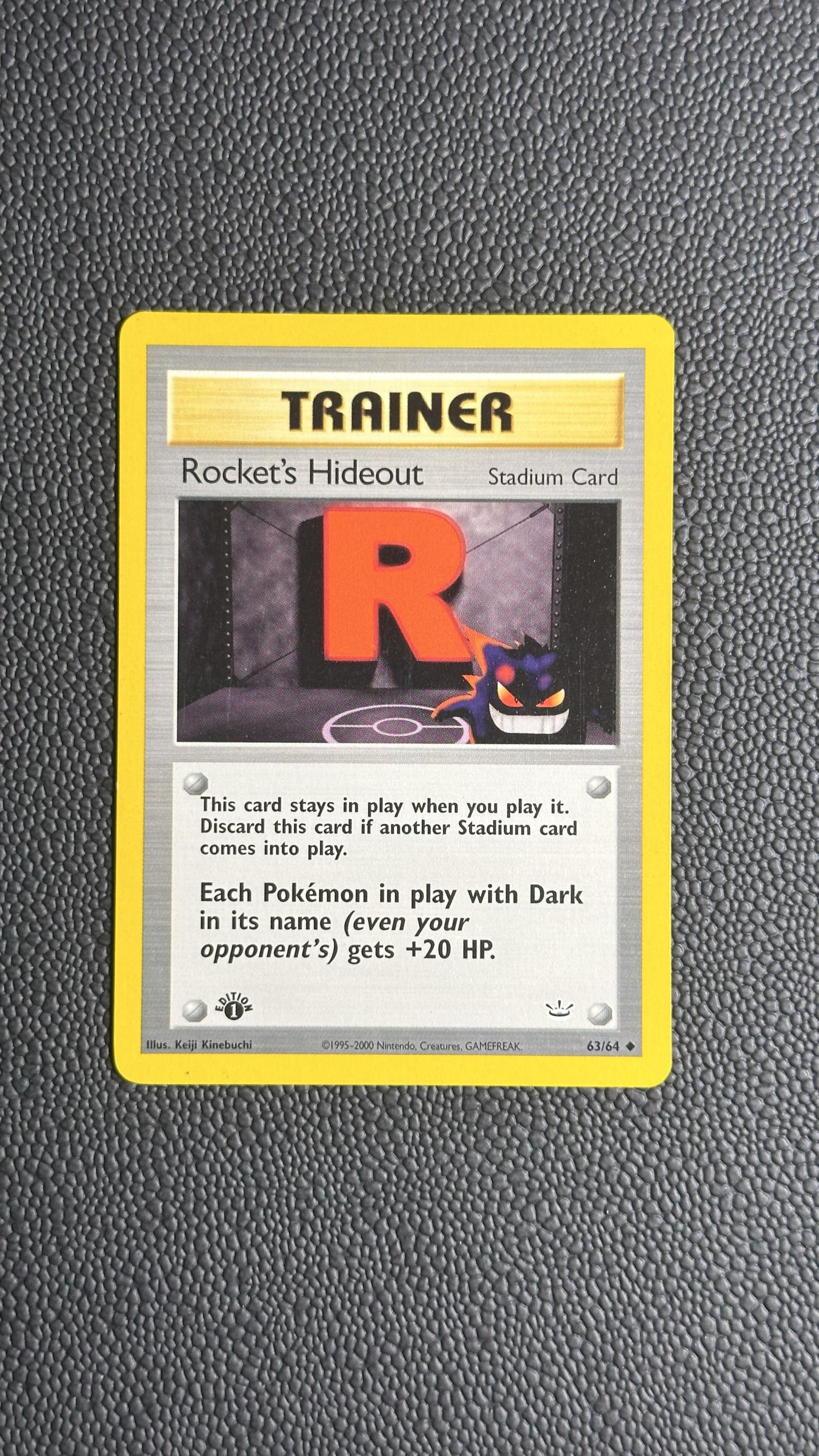 Rocket's Hideout is a Trainer Stadium card from the Team Rocket set, illustrated by Keiji Kinebuchi. This 1st Edition card has the collector number 63/64 and is a non-foil card. It grants +20 HP to each Pokémon with Dark in its name and is more collectible than meta-playable due to its niche use in deck strategies.