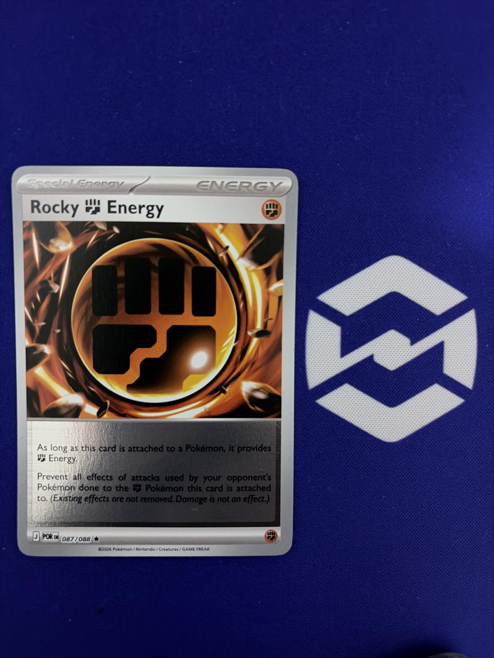 Rocky Energy card from the Pokemon Scarlet & Violet: Paldea Evolved (POR) set. Card number 87/88. Artist info not available. This special energy card provides Fighting Energy and prevents effects of attacks from opponent's Pokemon to the Fighting Pokemon it's attached to. Language: English. Foil finish visible. Playable in meta as a support energy card.
