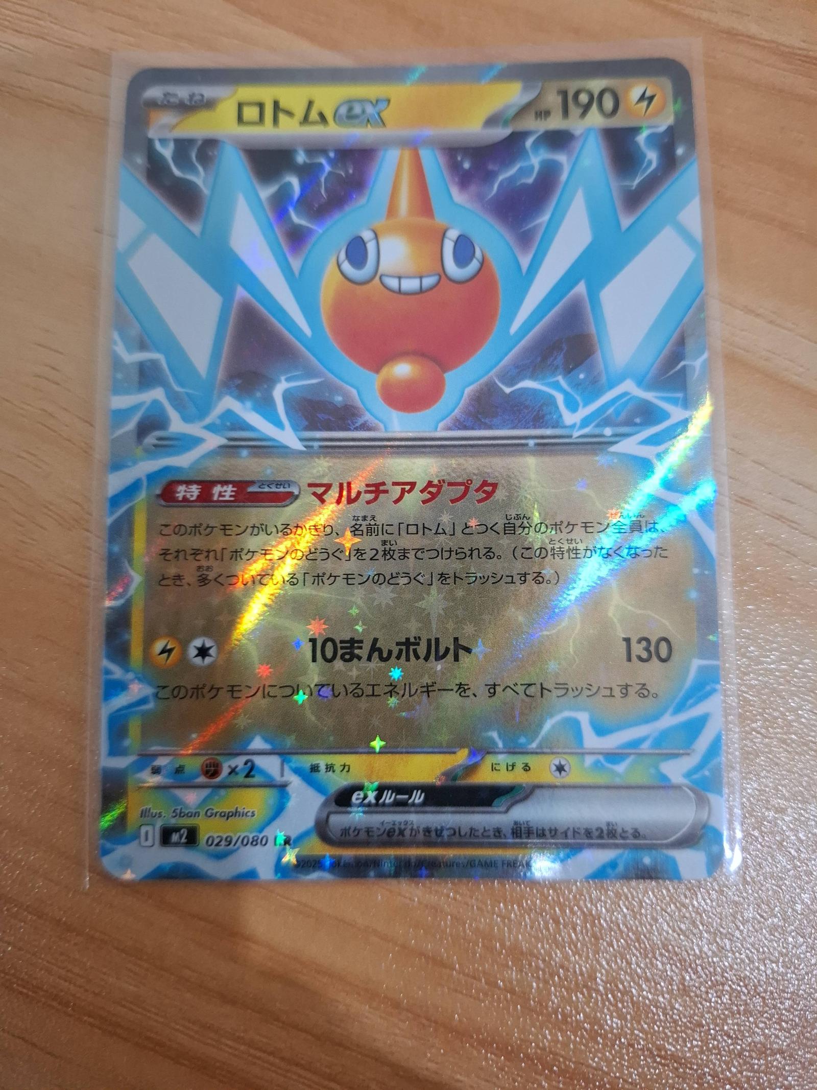 Rotom ex from Pokemon set 029/080 illustrated by 5ban Graphics. Japanese language card with holo foil. Playable card used in various competitive formats, featuring 190 HP and 130 attack power. Card number 029 from the set, card code M2. Collector's item and also suitable for gameplay.