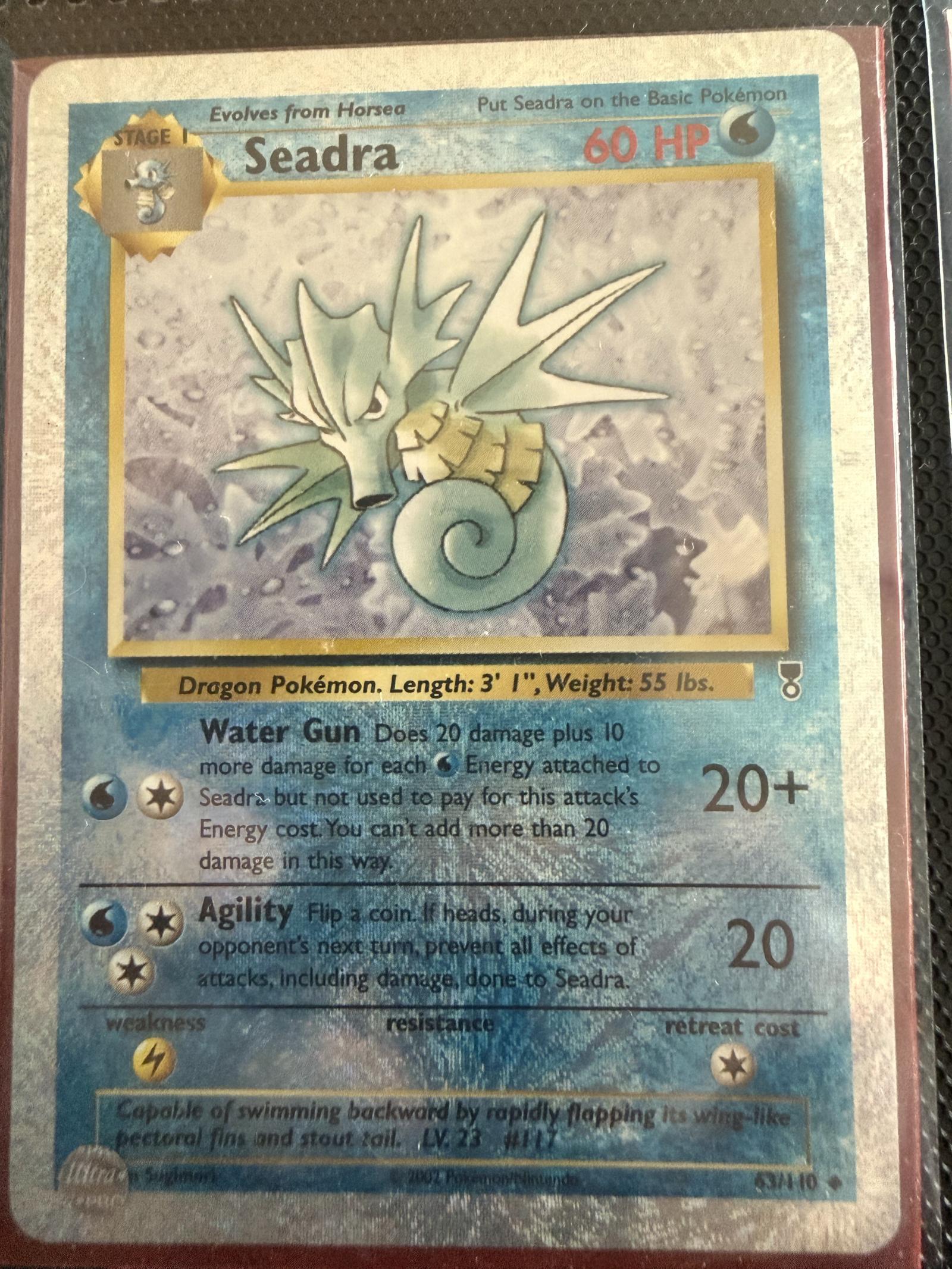 Seadra Pokemon card from the Fossil set (1995). Card number 34/110. It is a Water-type Stage 1 Pokemon with 60 HP. Features attacks Water Gun and Agility. Holographic foil card with playing damage effects. Illustrated by Ken Sugimori. This card is playable in various casual formats and is also a collectible from an early expansion set.