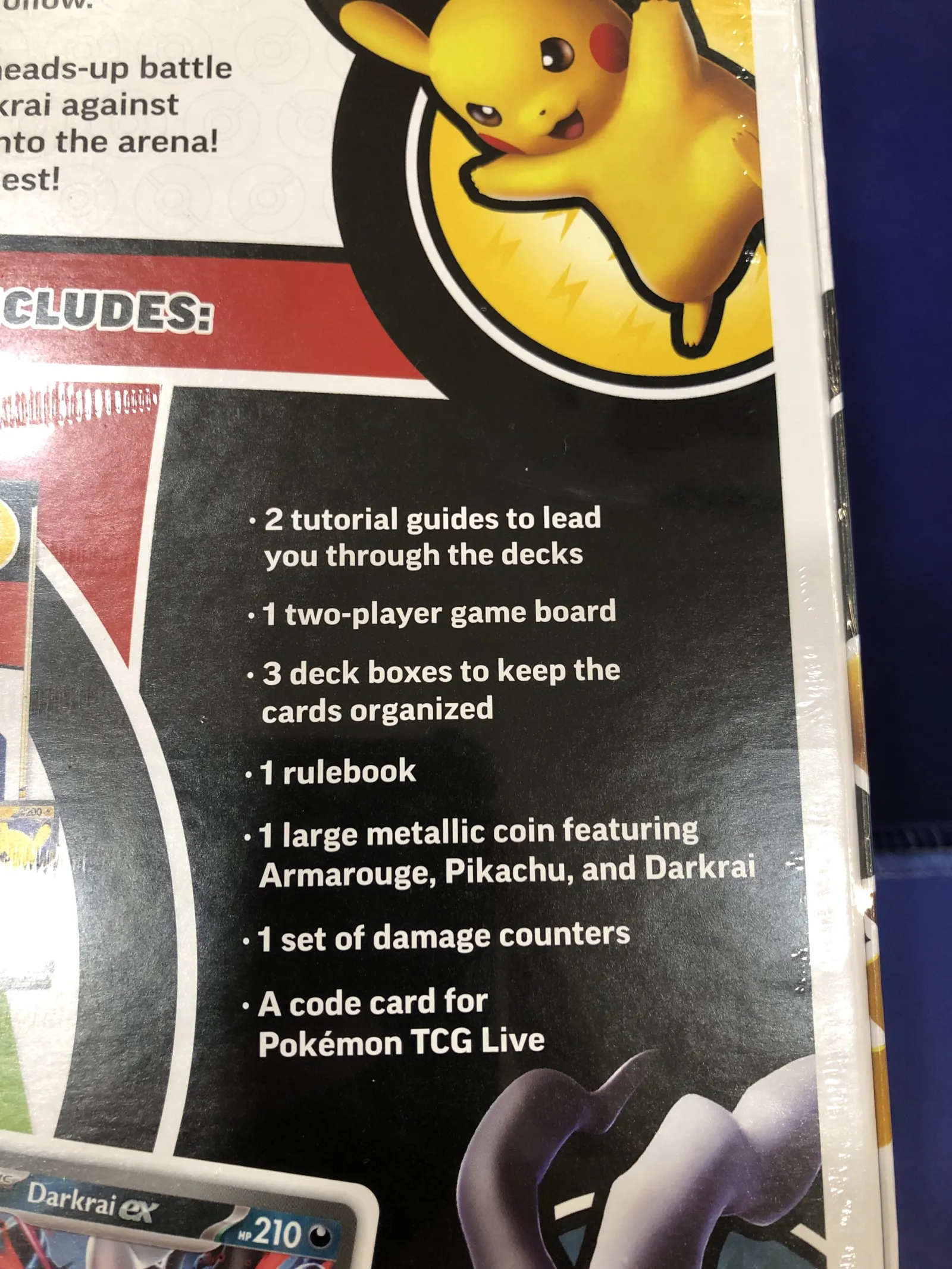 Includes : 1 two-player board, 3 deck boxes, 1 rule book, 1 large metallic coin featuring Armarouge, Pikachu & Darkrai, 1 set of damage counters. Plus a code card for Pokémon TCG live.