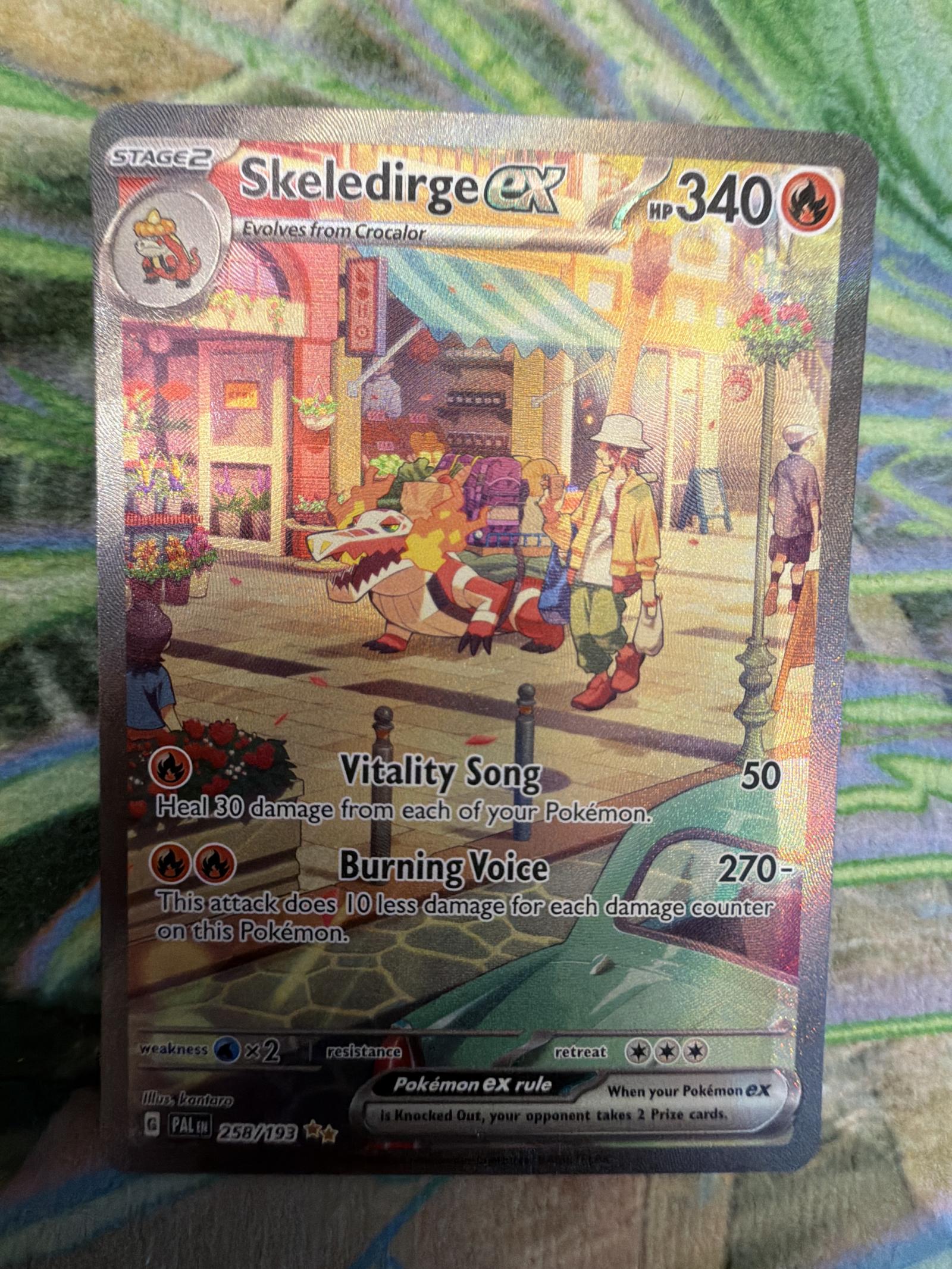 This is a full art holo Skeledirge ex card from the Pokemon Paldea Evolving set (card number 258/193). The card is illustrated by Kentaro and is a rare collectible with a foil treatment. It is a Stage 2 fire type Pokemon EX card with 340 HP. The card features powerful attacks like Vitality Song and Burning Voice. The card is playable in certain formats but mostly valued for collectors due to its special art and rarity.
