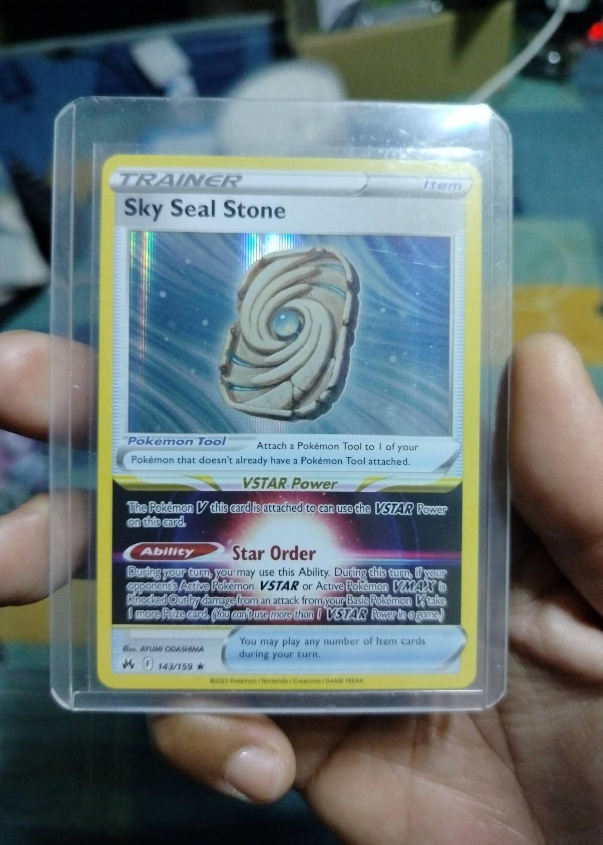 Sky Seal Stone is an Item Trainer card from the Pokémon TCG's Crown Zenith set (SVGG: CRZ). Its collector number is 143/159. The card features art by Ayumu Odashima and is notable for its VSTAR Power: Star Order ability, which allows a player to take an extra Prize card under specific circumstances. The card is a holofoil, as indicated by its reflective shine. 6-digit card code is not present on the front. Sky Seal Stone is playable in the Pokémon meta for decks using Pokémon V. Crown Zenith is celebrated for its collectible and competitive cards, making this useful for both collectors and players. Card is unslabbed (not graded).