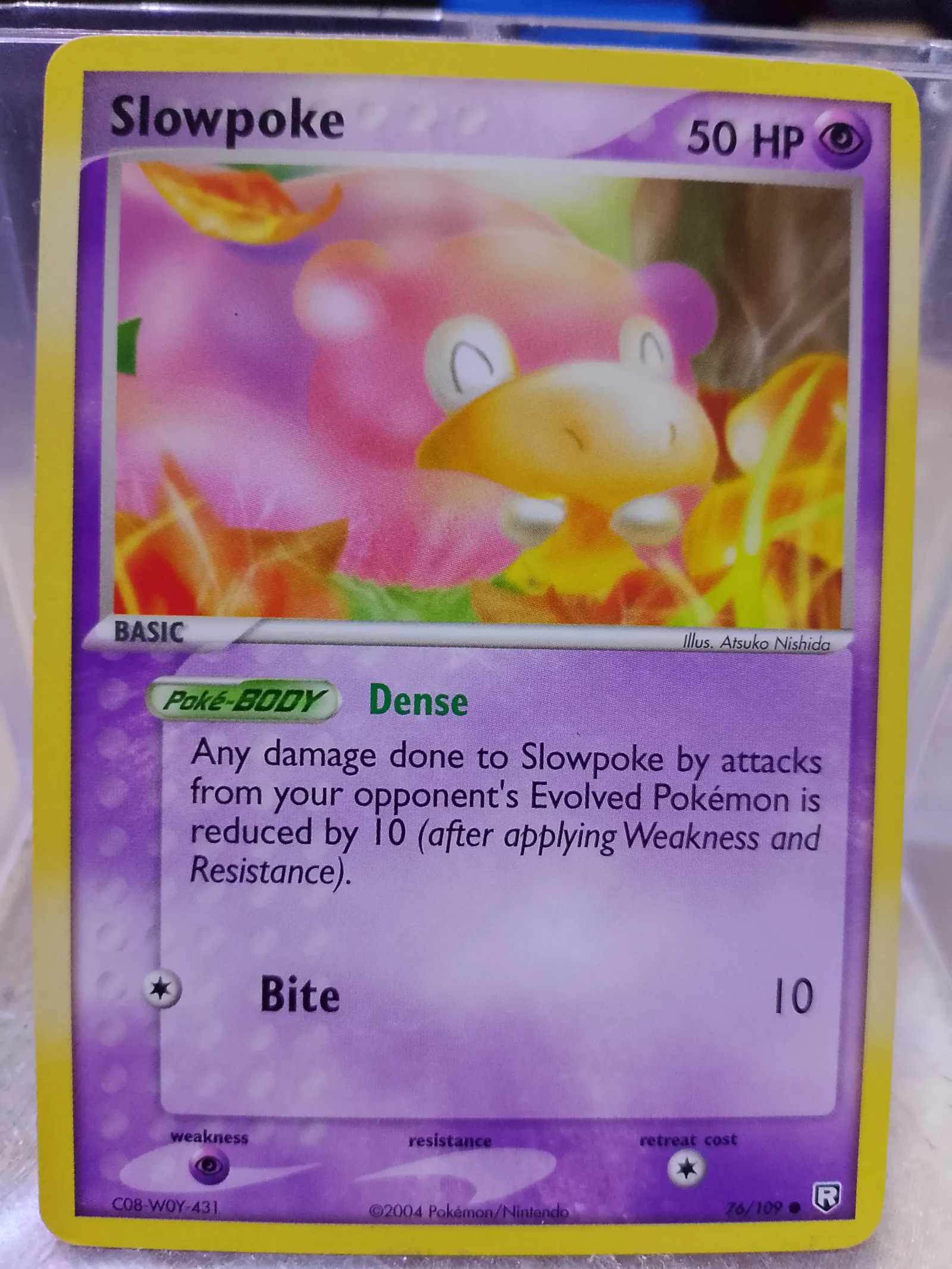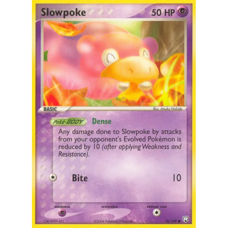 Slowpoke card from the EX Ruby & Sapphire set, collector number 76/109, English language. Illustrated by Atsuko Nishida. This card features the Dense Poké-BODY ability and Bite attack. It is a normal printing treatment card from 2004, suitable for collectors and casual play but not considered meta-playable.
