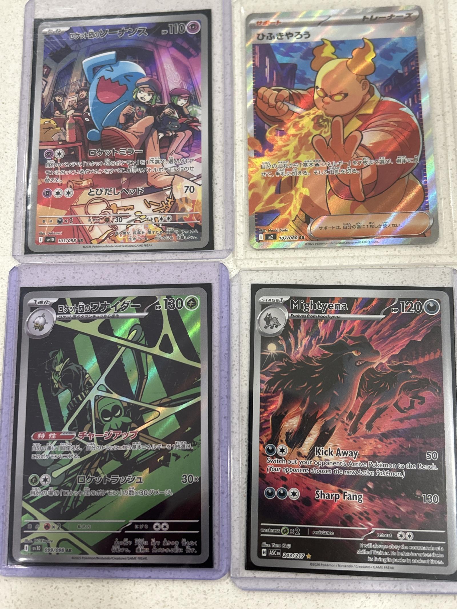 This lot includes 4 Japanese Pokémon cards: Rocket's Sneasel & Houndoom AR card #103 from set sv10 by artist Naoki Saito, a full art rare card; Hibikigoro Trainer card #107 from set sv12, a secret rare foil card; Rocket's Weavile AR card #099 from set sv10, a full art rare card; and Mightyena Holo card #243 from set asr (Astral Radiance), playable in the meta. All cards feature artwork, language code JPN, and varying foil treatments.