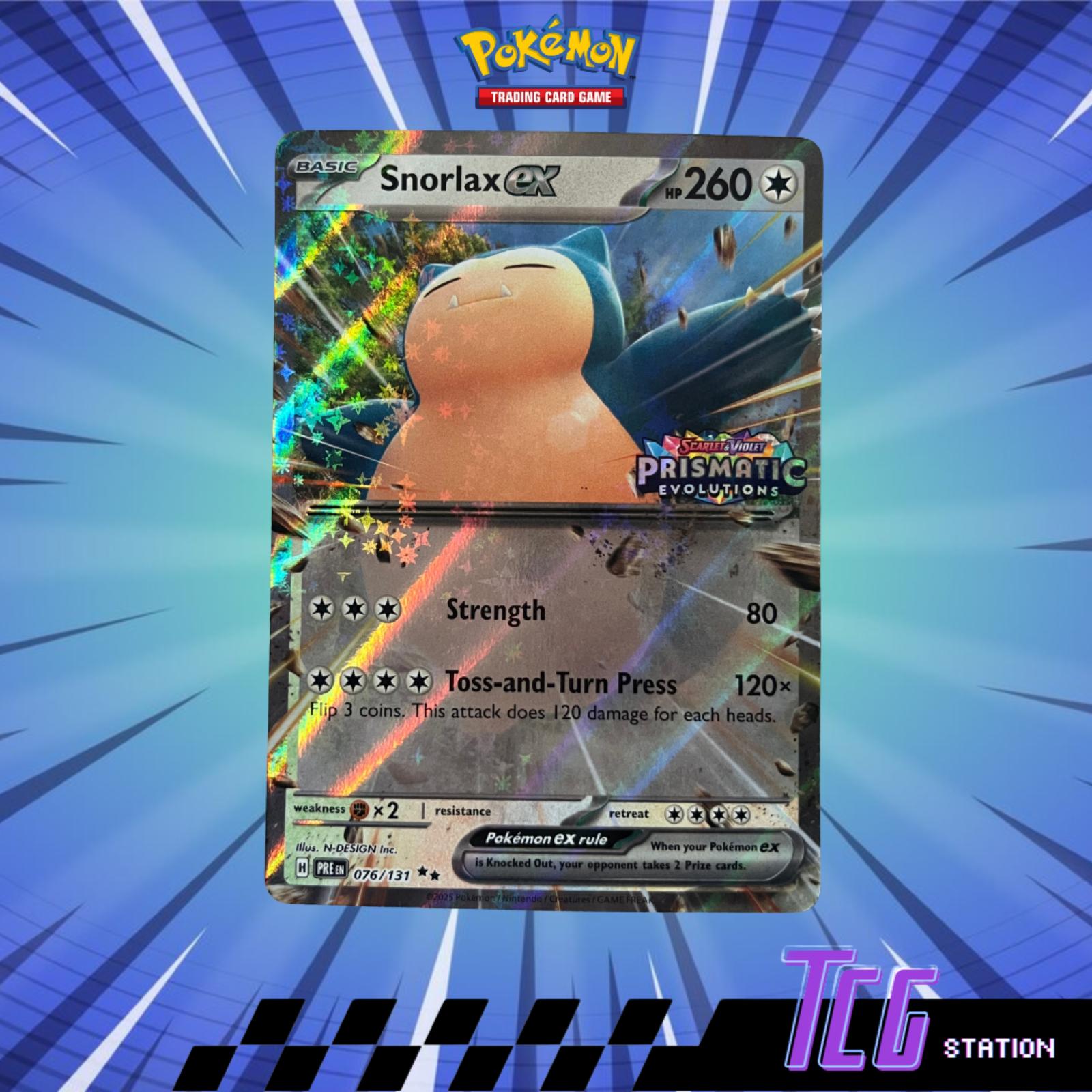 Snorlax GX card from the Prismatic Evolutions set (card code 076/131). Illustrated by N-DESIGN Inc. Features a prismatic holo foil finish. Playable in the Pokemon TCG meta. Includes attacks Strength and Toss-and-Turn Press with special GX effects.