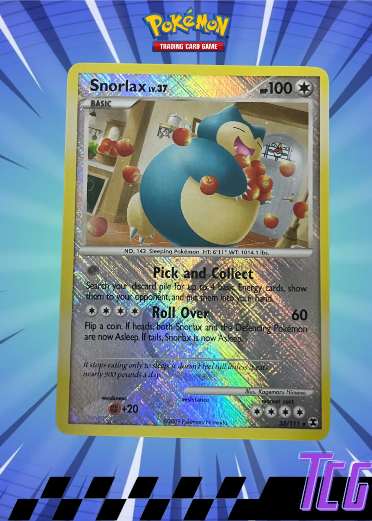 The standout feature is its stunning holographic background, a signature of rare cards from this era. This Snorlax showcases charming artwork by Kagemaru Himeno, depicting the iconic Pokémon surrounded by apples in a playful scene. Card number 33/111, it offers solid value as both a collectible and a playable card thanks to its unique moves: "Pick and Collect" and "Roll Over."