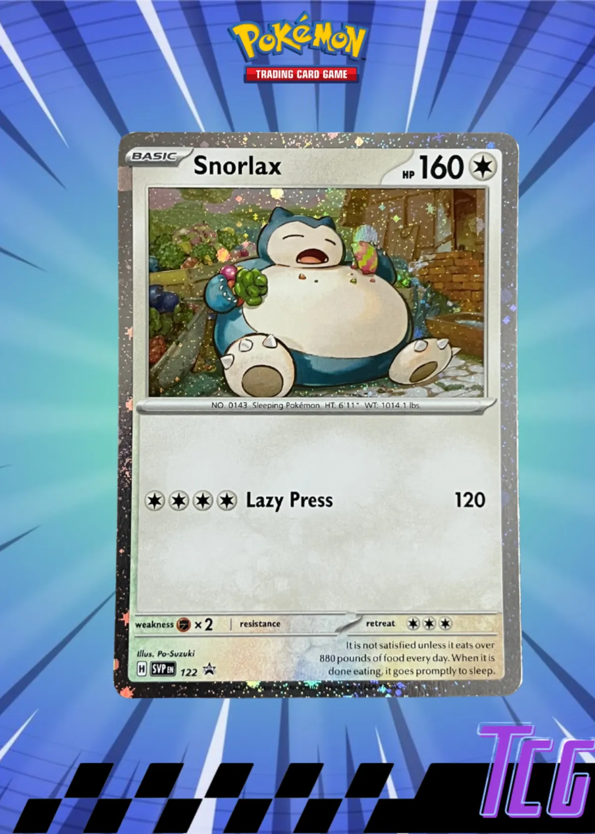Featuring artwork by Po-Suzuki, this Snorlax card showcases the charming character relaxing amidst a feast. The card boasts a solid 160 HP, and its signature attack, Lazy Press, delivers a powerful 120 damage—making it memorable both for play and display. As a Black Star Promo, this card holds added collectibility due to its limited distribution compared to standard set cards.