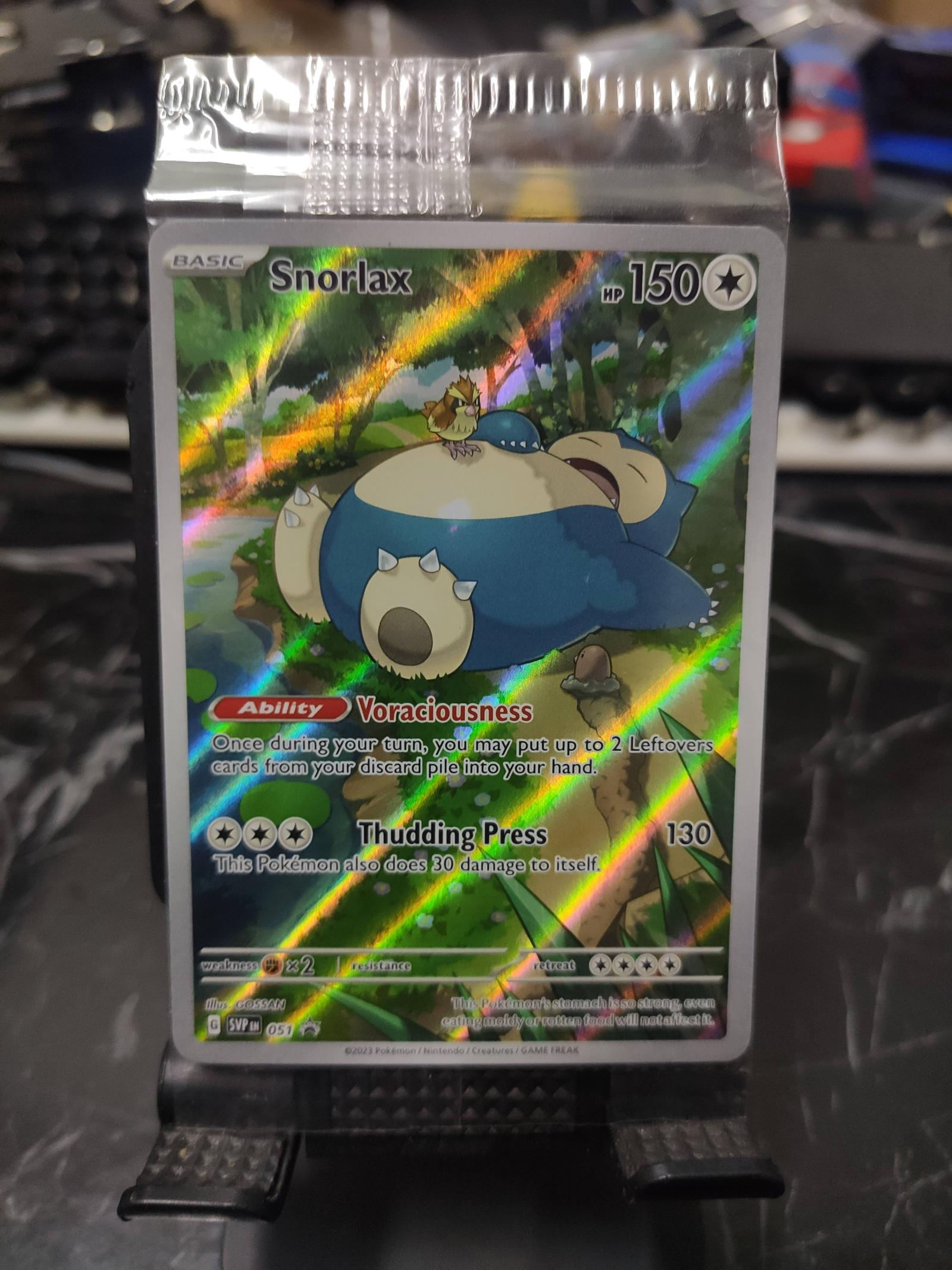 SEALED Snorlax from the Pokemon TCG set SVP (Sword & Shield Promotional) with card code 053/064. This full art foil card features the ability 'Voraciousness' and the attack 'Thudding Press'. Playable in meta decks and collectible for its striking holo pattern. Artist: 5ban Graphics. Language: English.