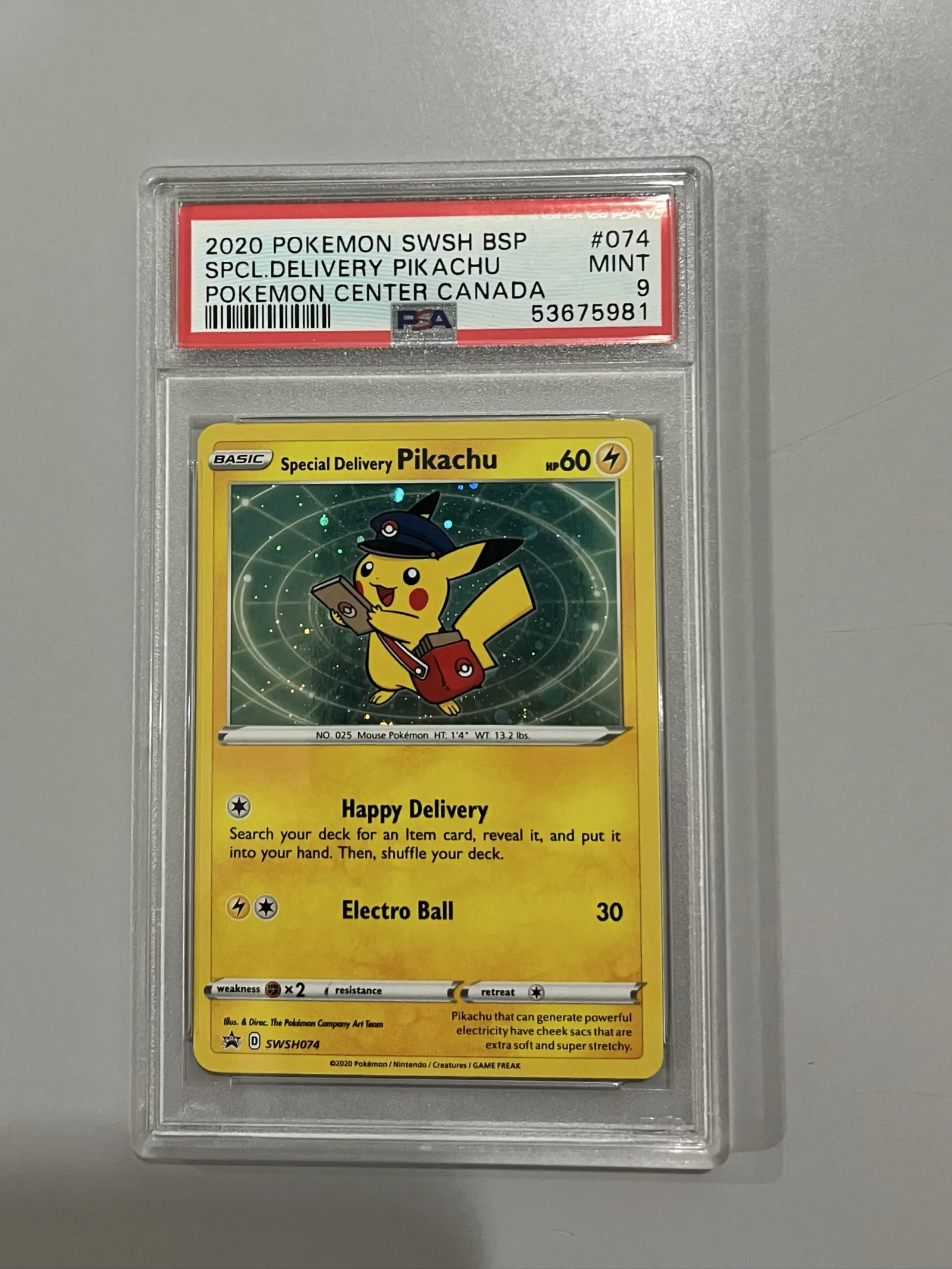 💎Card: Special Delivery Pikachu (SWSH Promo) 💎Grade: PSA 9 (Mint) 💎Condition: Excellent overall with strong surface, edges, and centering typical of a PSA 9 💎Authenticity: Professionally graded and encapsulated by PSA
