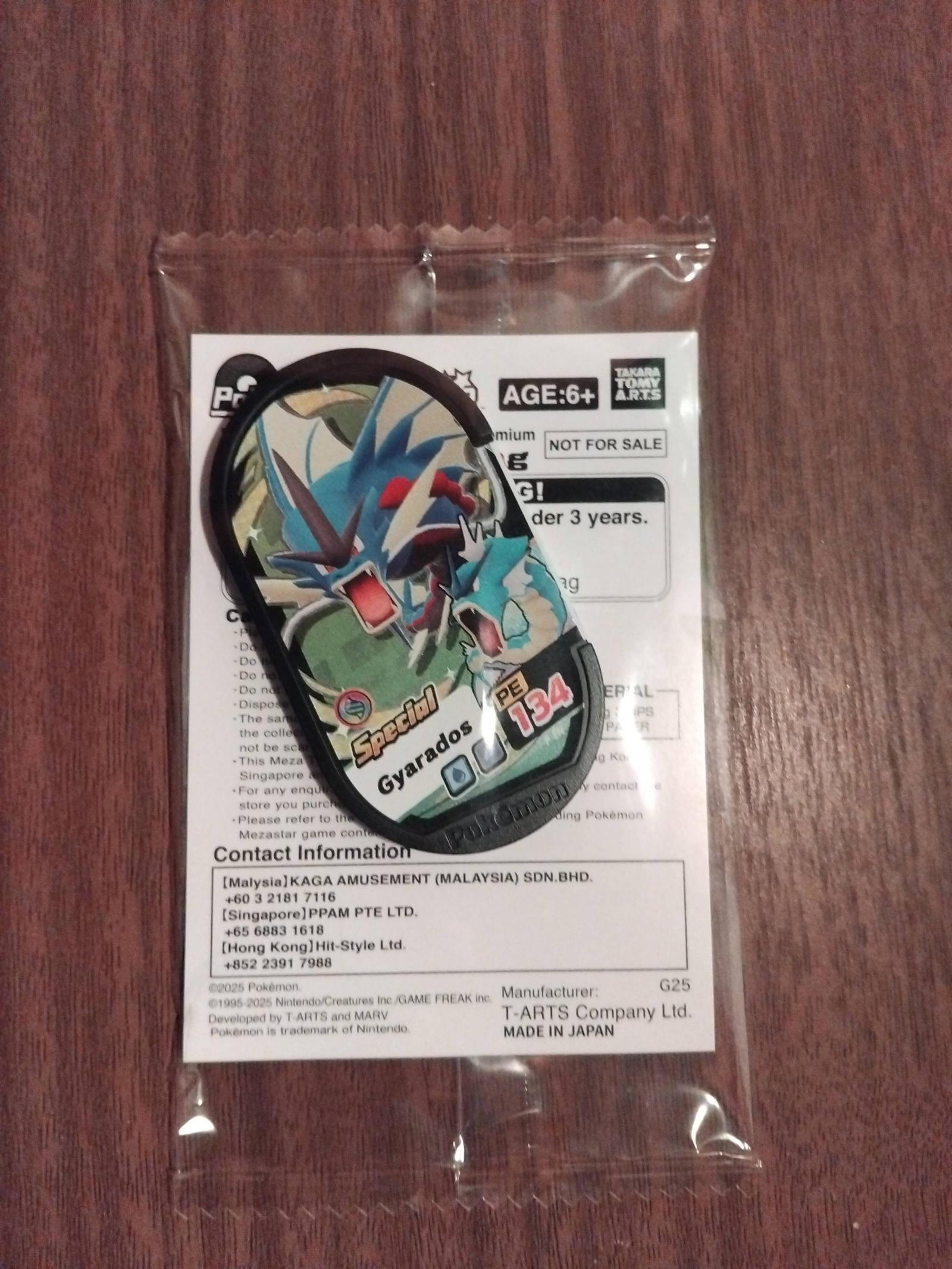 Special Gyarados peg marker produced by T-ARTS Company Ltd. Made in Japan. Part of a collectible series used for Pokemon tabletop games, not a playable trading card. Not for sale item from 2005. Package shows contact info for Malaysia, Singapore, and Hong Kong distributors. No foil or graded status.