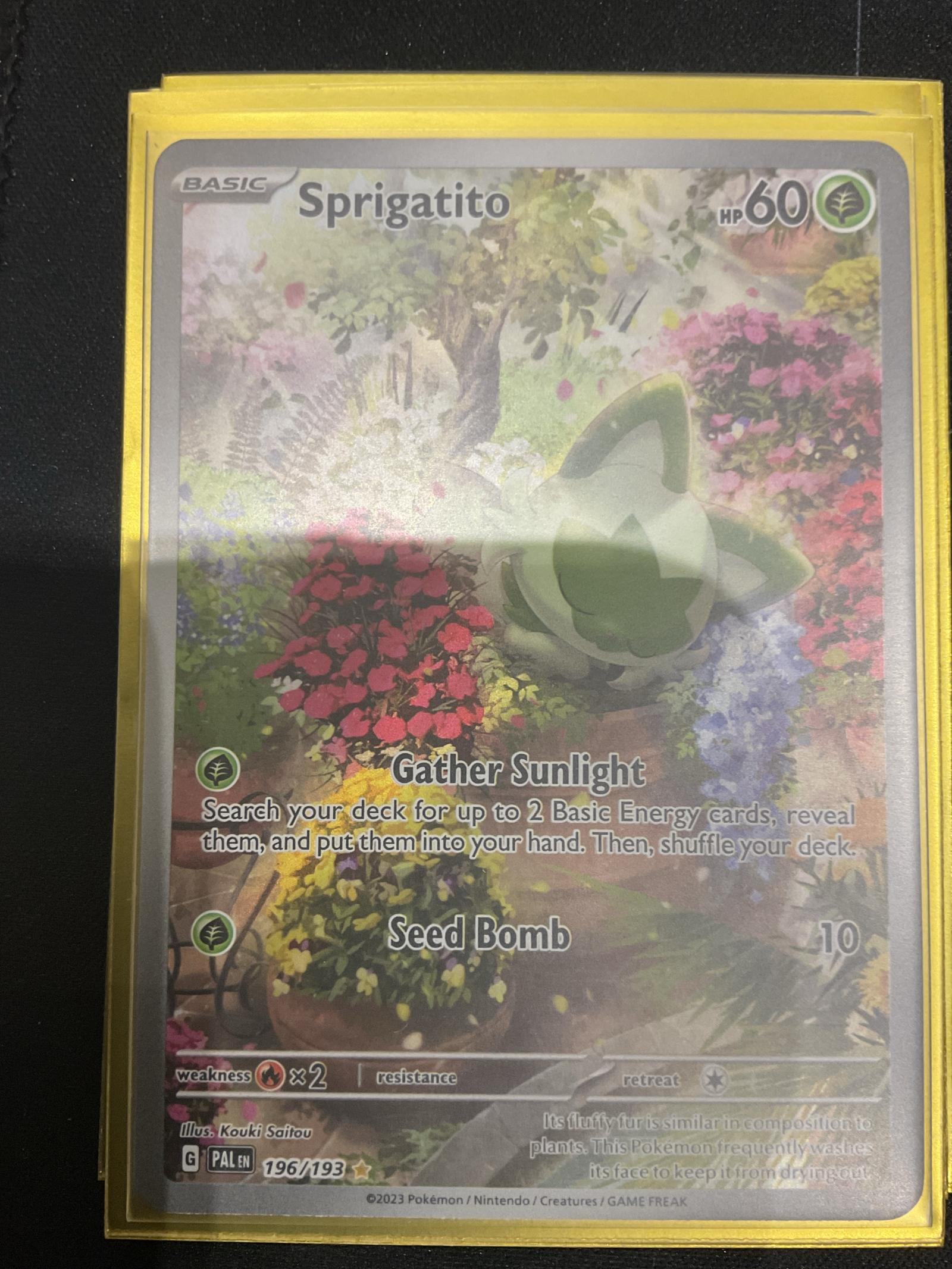 Sprigatito card from the Pokemon Scarlet & Violet Promo set, card number 196 out of 193. Illustrated by Kouki Saitou. Foil holo treatment. Language: English. Playable basic Grass-type Pokemon with attacks Gather Sunlight and Seed Bomb. This card features a special set code PAL and is collectible as well as usable in current meta decks.