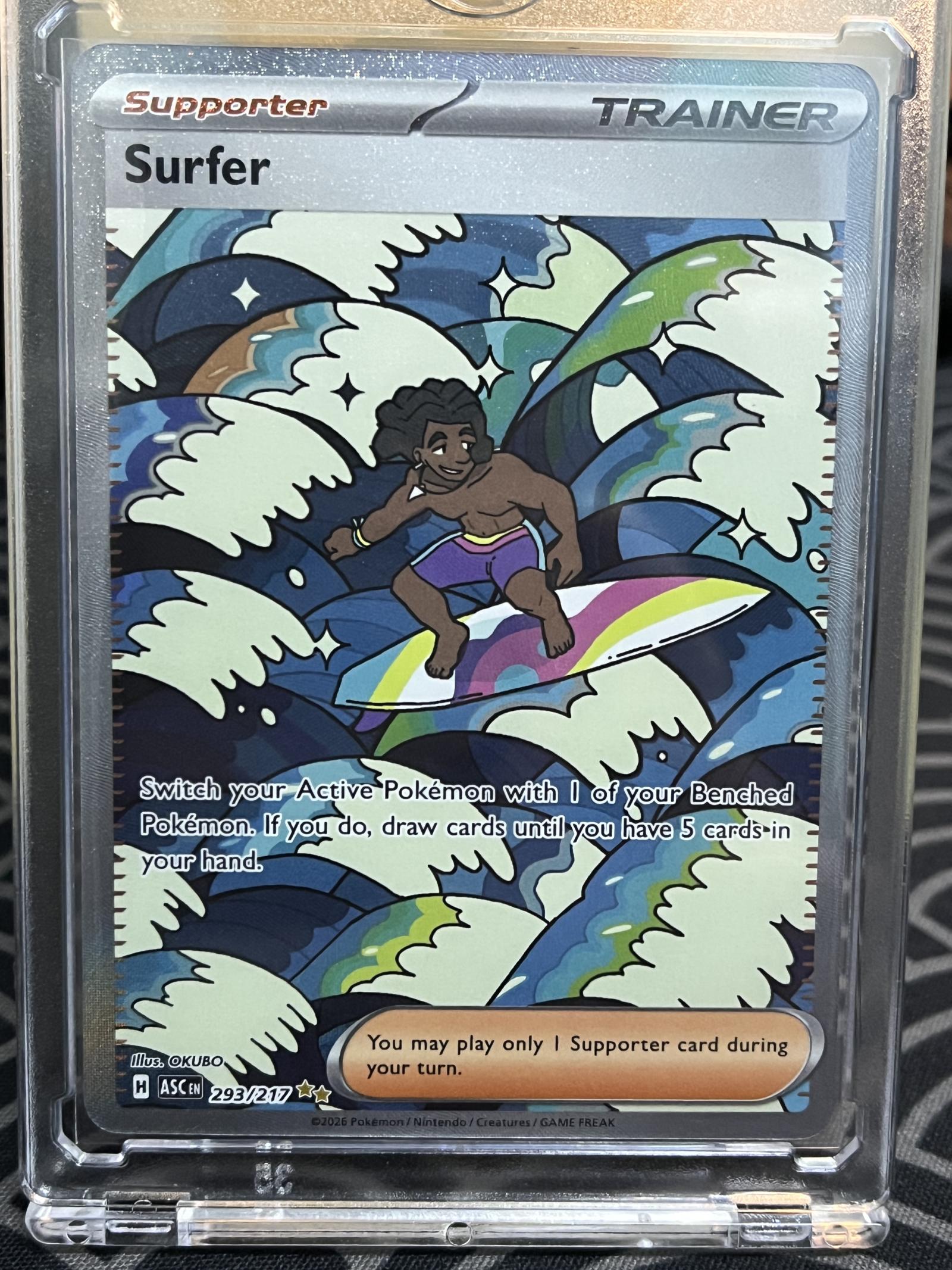 Surfer Trainer card from the Pokemon TCG, card number 293/217, set code ASC, English language. Illustrated by OKUBO. This is a full art card featuring unique artwork and collectible appeal. The card is foil and playable in certain deck strategies. The card is graded and slabbed, ensuring preservation and authenticity.