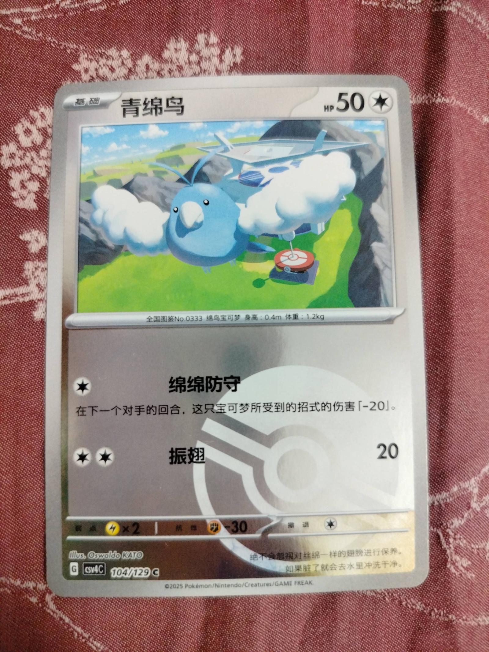 Swablu card from the Sword & Shield set (104/129), illustrated by Oswaldo KATO. The card is in Chinese and is a non-foil common card. It features HP 50 and two moves, including a damage reduction ability. Suitable for collectors due to its Chinese print and normal rarity.