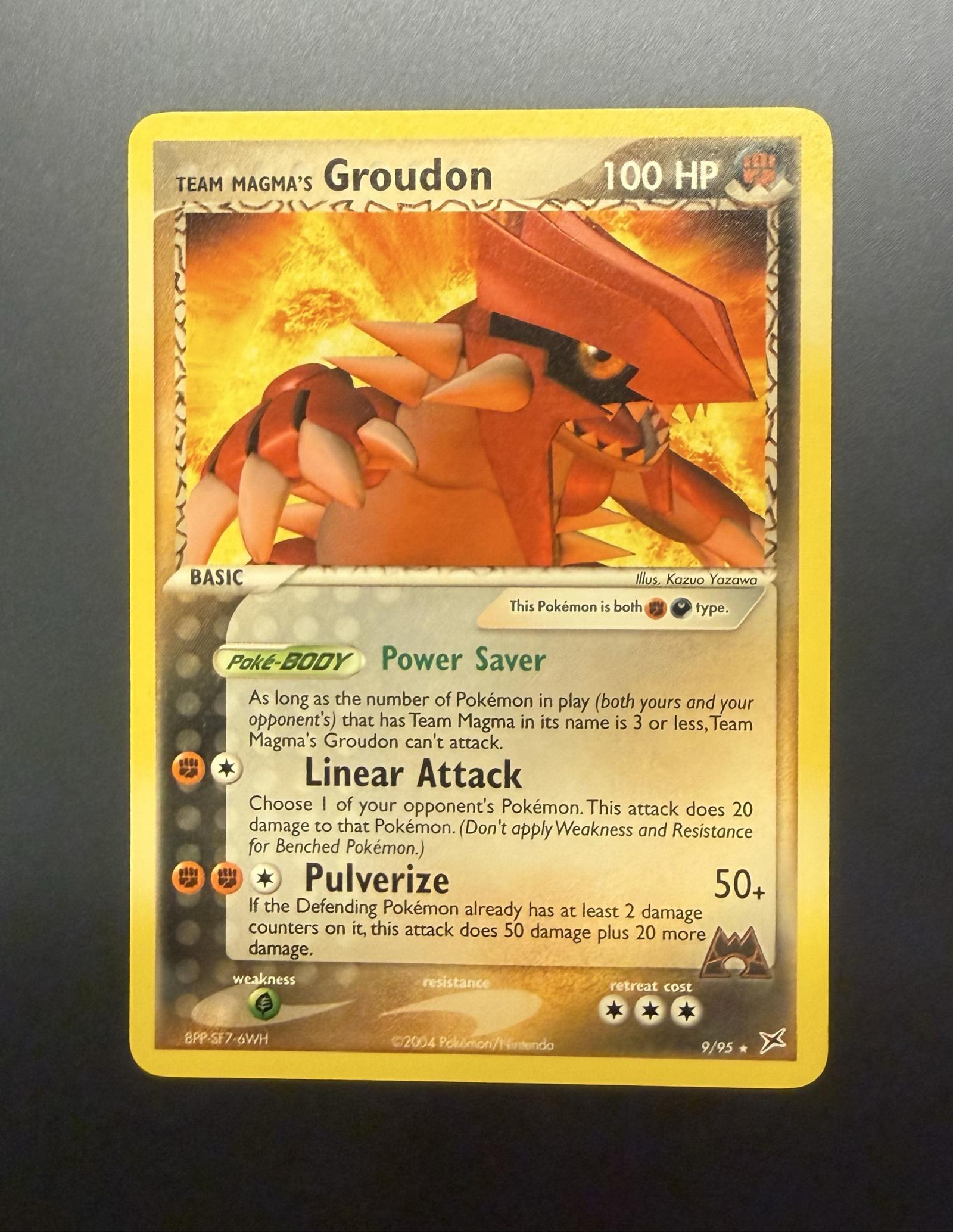 Team Magma's Groudon card numbered 9/95 from the EX Team Magma vs Team Aqua set. Illustrated by Kazuo Yazawa. This card is in English and features a normal printing treatment. It has 100 HP and includes the Poké-Body Power Saver. Released in 2004 by Pokémon/Nintendo. This card is more collectible but can be used in casual play rather than the current competitive meta.