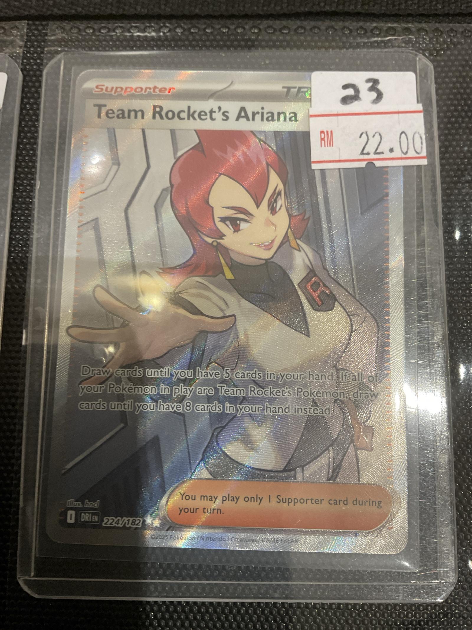 Full art Trainer Supporter card 'Team Rocket's Ariana' from the Dragon Majesty set (DRI), card number 224/182. This English language card was illustrated by hidenori and features a holo printing treatment. A useful card both for collectors and playable in the current meta. The card is foil and has the card code 6-DIGIT NOT VISIBLE.