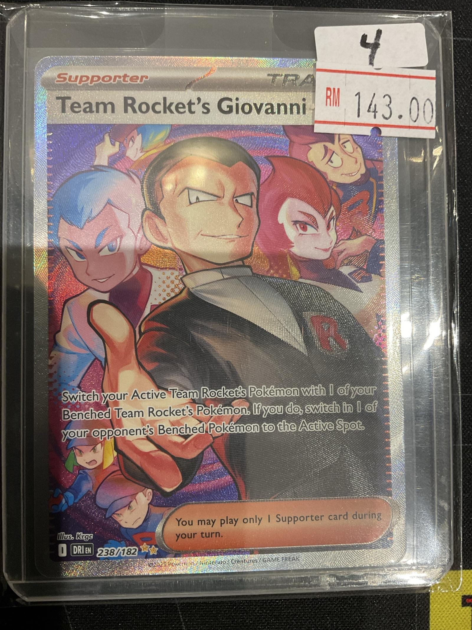 Full art holo Supporter card 'Team Rocket’s Giovanni' from Sword & Shield Darkness Ablaze set (card #238/182). Illustrated by Krgo, this is a secret rare, playable card with a unique effect allowing bench switches involving Team Rocket's Pokémon. English language. Highly collectible and sought after in the meta due to its strategic play potential.