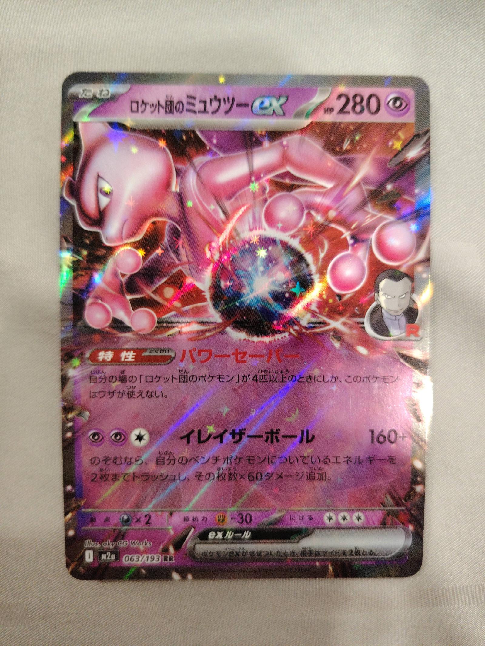 Japanese Team Rocket's Mewtwo ex from the set 063/193, artist 5ban Graphics. This ultra rare RR card features holo foil treatment and is sought after for collectors. The card is playable but generally valued for its collectible status due to its rarity and unique design.