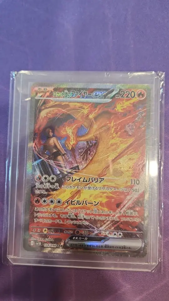 Notable features • Secret/overprint numbering (124/098) — a collectible trait that often attracts set-completers and secret-letter collectors. • Full-art ex illustration with holo/foil treatment across the face — visually striking and displays well in collections or frames. • Japanese printing — sought after by some collectors for variants, language diversity, and alternate-text print runs.