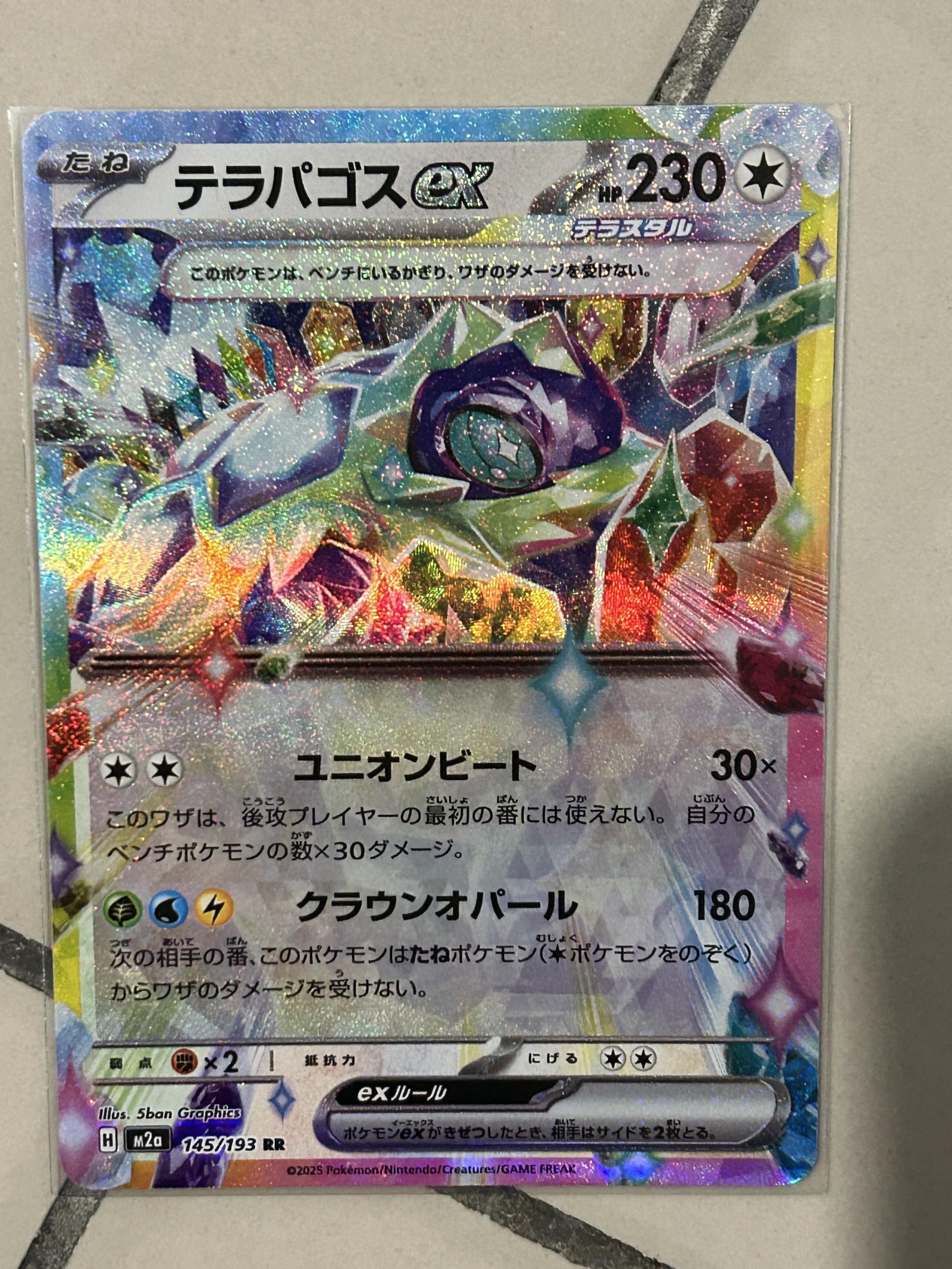 Terapagoss EX (テラパゴスEX) is a Rainbow Rare card from the Pokémon TCG M2a set. Card number 145/193, illustrated by 5ban Graphics. This Japanese holo foil card features stunning sparkling terastal effects. It has 230 HP and is a playable EX Pokemon with notable moves Union Beat and Crown Opal. A collectible and competitive card for Pokémon TCG players and collectors. No grading information available.
