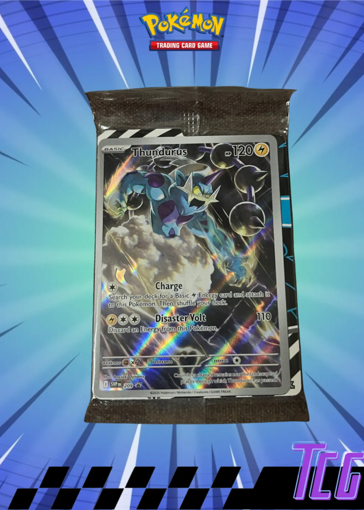 This listing features a Thundurus SVP Black Star Promo #209 from the Pokémon TCG, presented in raw and ungraded condition, still sealed in its original packaging. As a holographic promo card, this Thundurus boasts dazzling foil artwork by Anesaki Dynamic, making it an eye-catching addition to any collection.