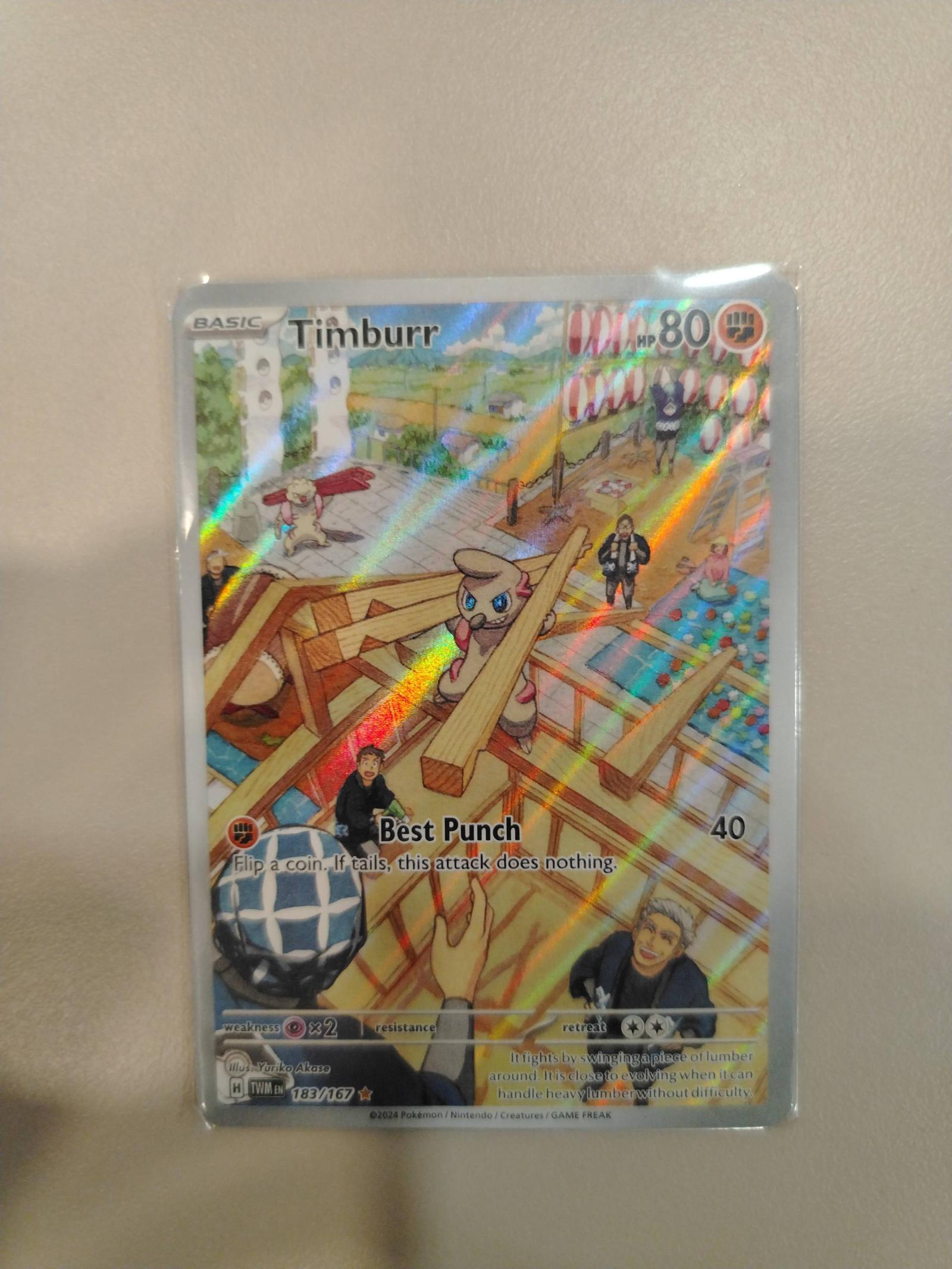 Timburr card from the Pokémon TCG Scarlet & Violet set with card number 183/167. Illustrated by Akasa Parko. This is a holo rare card with dynamic full-art style. Card plays as a Basic Fighting-type with an 80 HP and the Best Punch attack. Playable in the meta with useful fighting type abilities. The card code is 183/167. Foil finish makes it a collectible highlight.