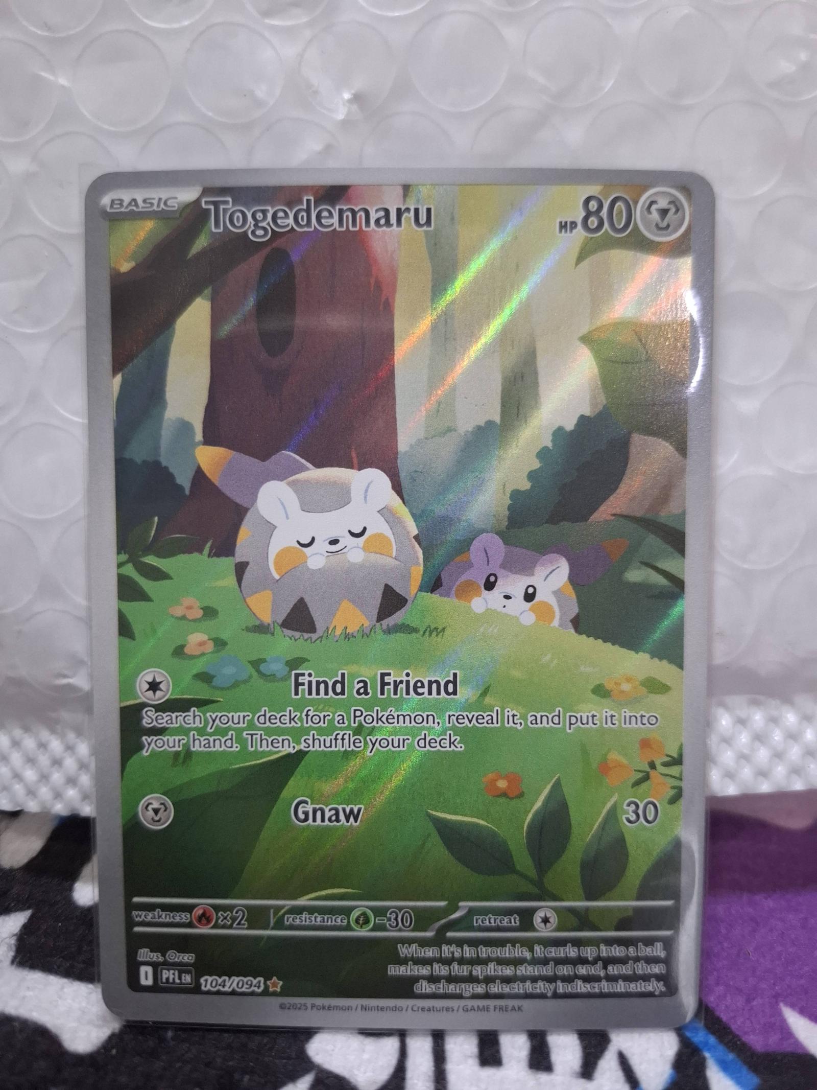 Togedemaru card from the 2025 Sword & Shield Promo set (PFL), card number 104/94. Illustrated by Orco. This holo foil card features moves 'Find a Friend' and 'Gnaw'. Playable in casual formats; collectible and visually appealing due to its holo treatment and secret rare numbering. English language edition.