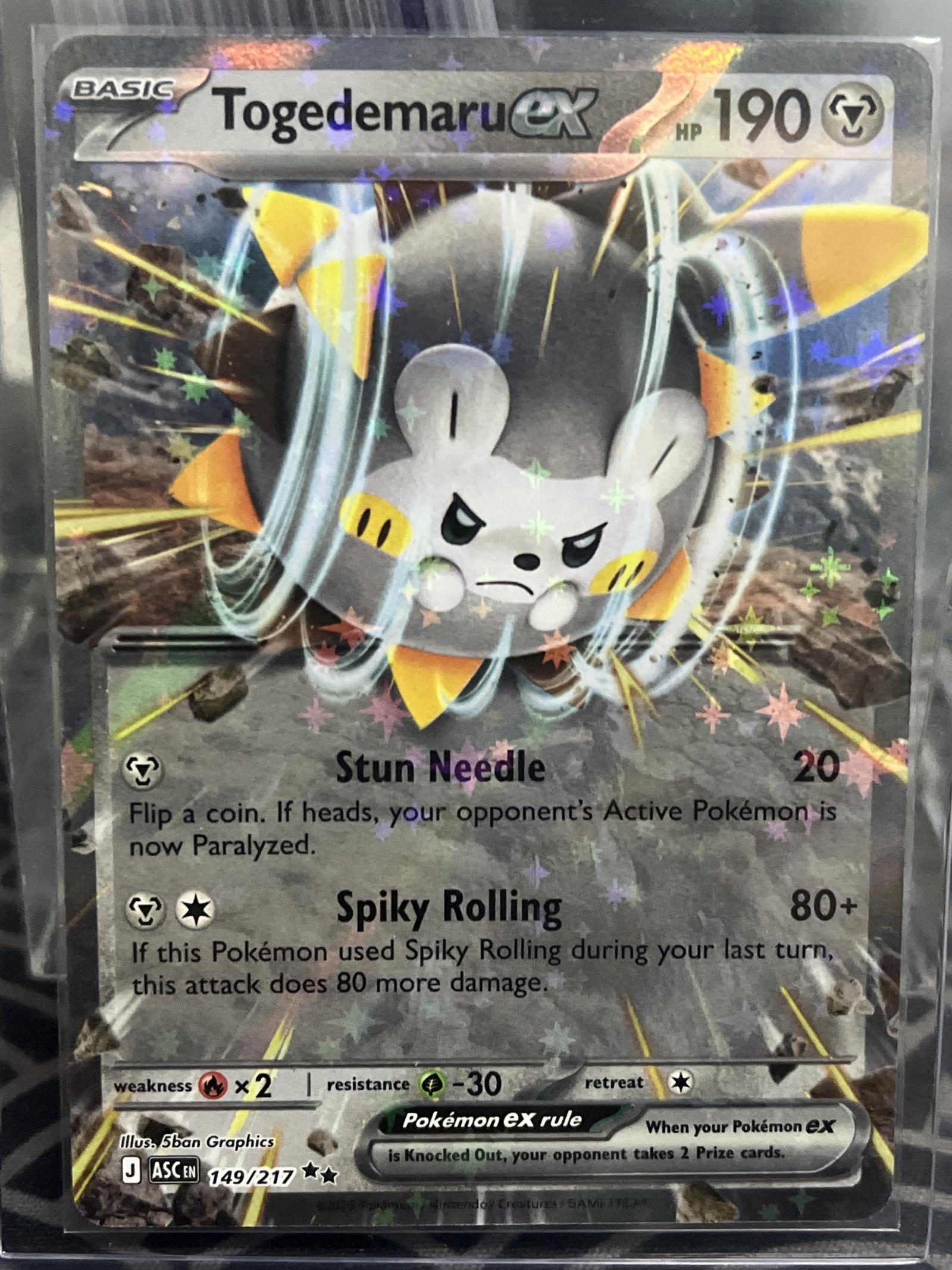 Togedemaru ex card from the Pokémon EX Black Star Promo set (149/217), illustrated by 5ban Graphics. English language foil card featuring the Pokémon EX rule. Playable in meta and highly collectible due to its EX status and holo foil treatment.