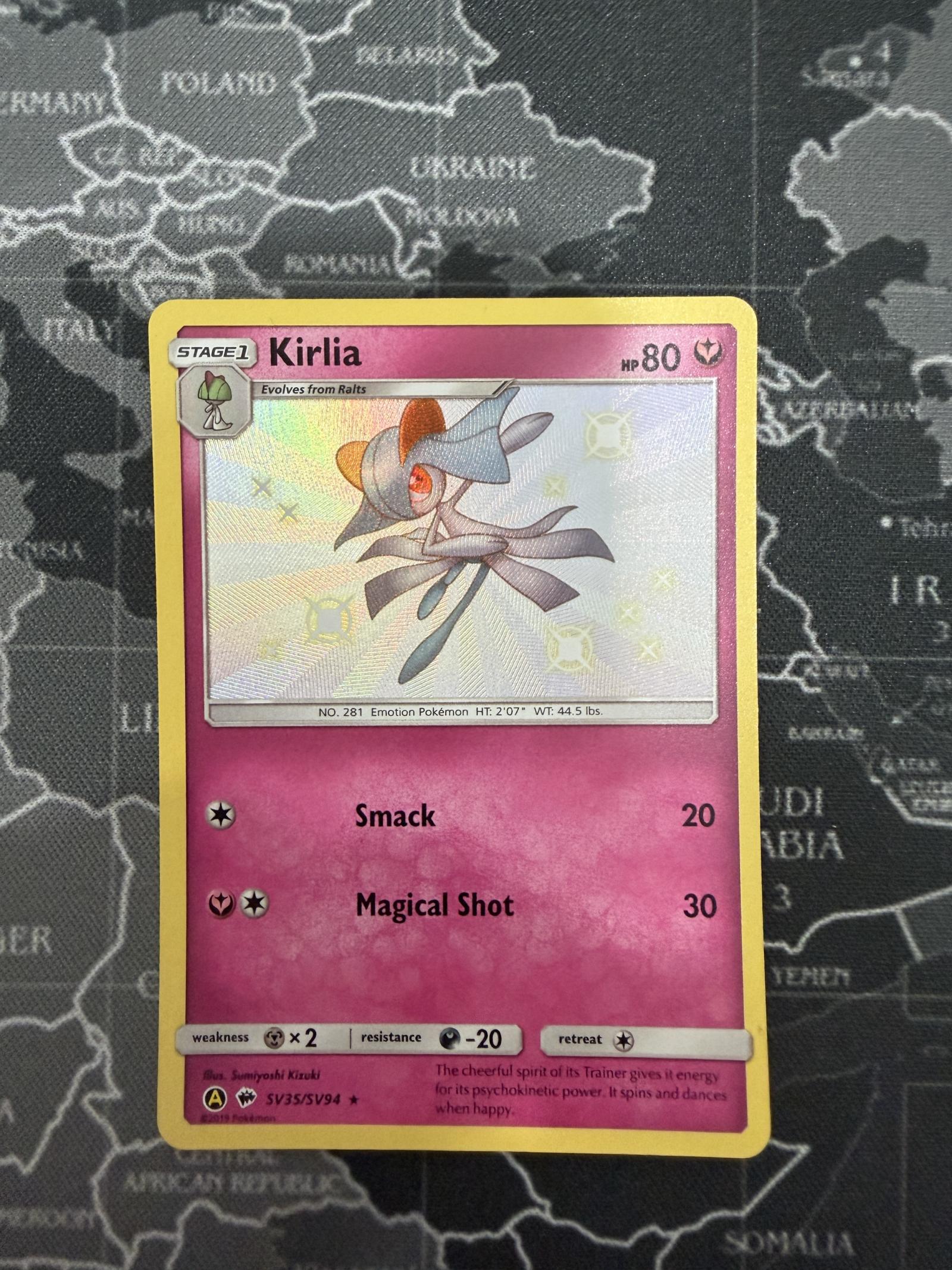 This is a Pokémon Kirlia collectible trading card, Stage 1 evolution from Ralts. The card features holographic foil with attacks Smack (20 damage) and Magical Shot (30 damage). It has an HP of 80 and includes weakness, resistance, and retreat cost details. Card number SV35/SV94 from the set. Suitable for collectors and Pokémon TCG enthusiasts.