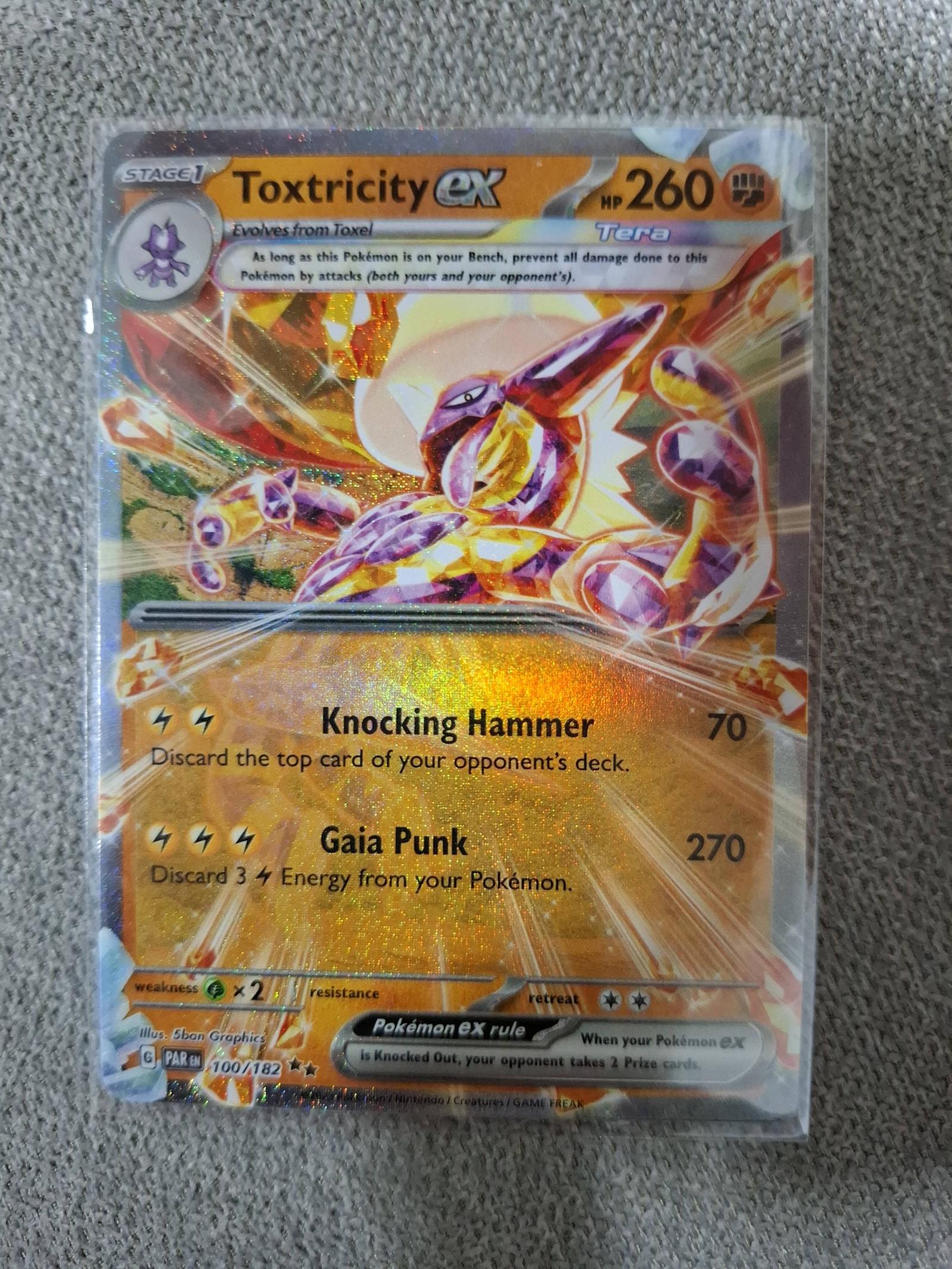 Toxtricity ex (card code: 100/182) from the XY Primal Clash set. Illustrated by 5ban Graphics. This card is holographic (foil). Toxtricity ex is a Stage 1 Pokémon with 260 HP. Features powerful attacks Knocking Hammer and Gaia Punk. This card is collectible and playable in Pokémon TCG meta. Condition appears excellent.