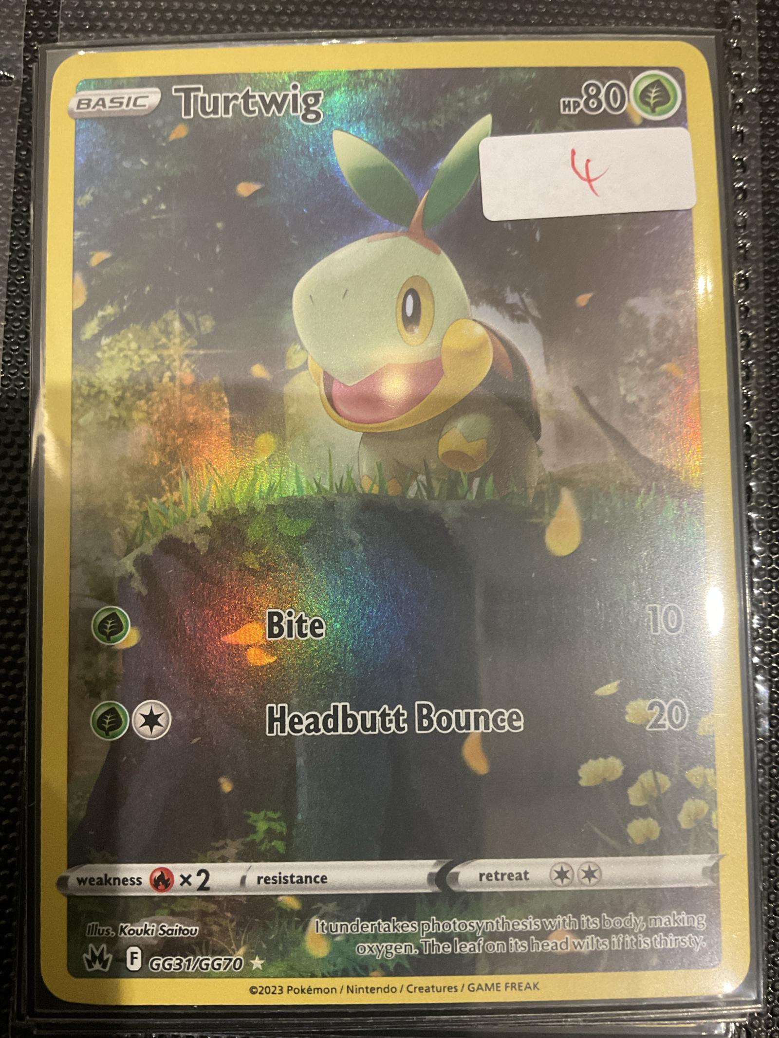 Turtwig card from the 2023 Pokémon set GG31 (GG70), illustrated by Kouki Saitou. This holo card features Turtwig with attacks Bite and Headbutt Bounce. Playable in Pokémon TCG. Foil finish.