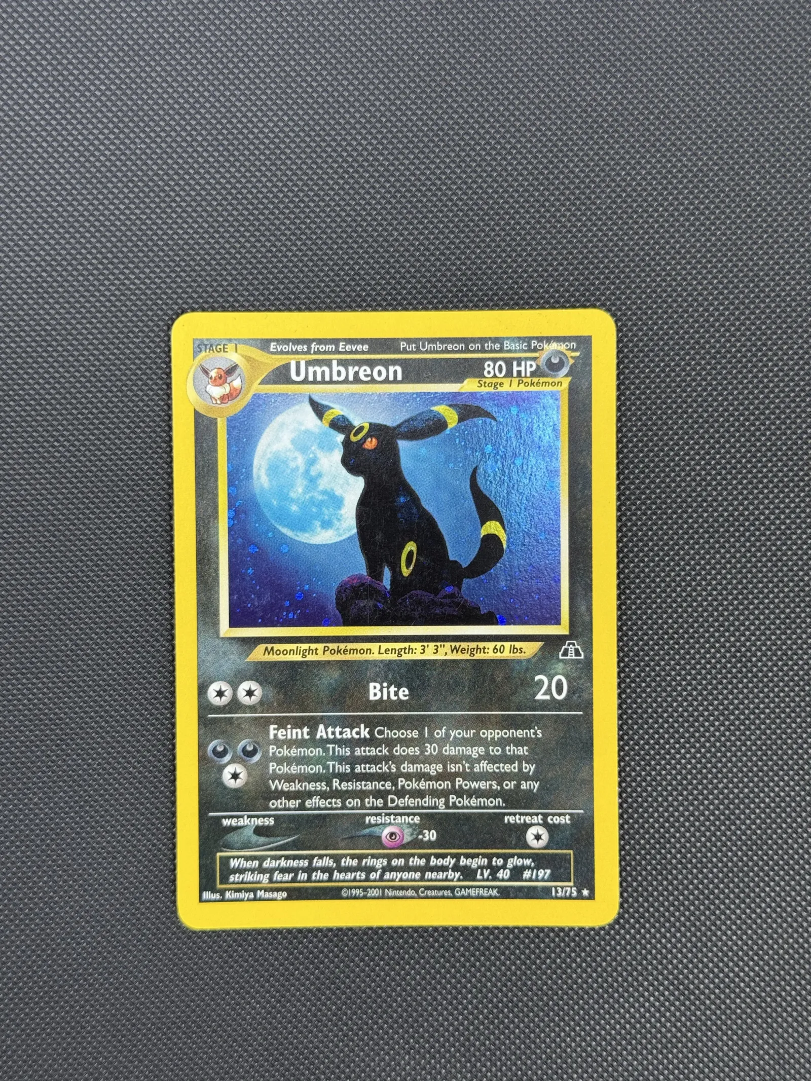 Umbreon "OG Moonbreon" 13/75 from Neo Discovery Set, released in 2001, Excellent Condition. Viewing available at Collektr Experience Center Amcorp Mall from Friday (5/12) onwards. 10am-6pm