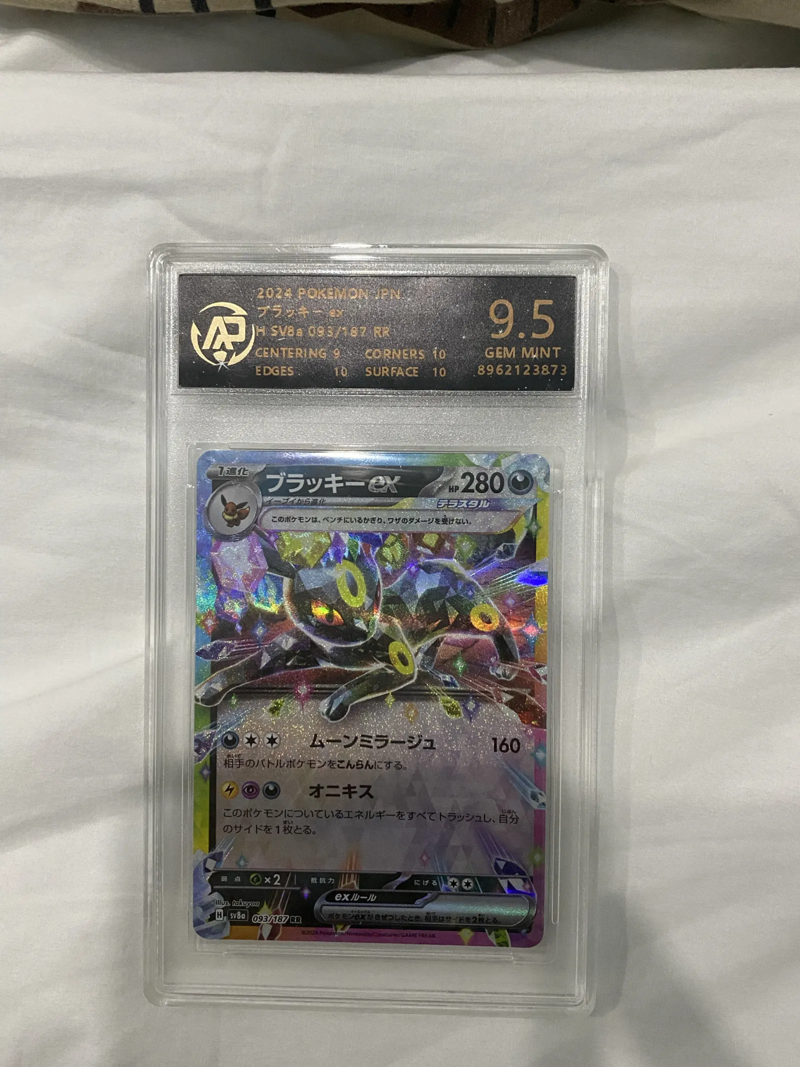 A premium Umbreon ex card graded 9.5 (Gem Mint), one of the most popular and highly demanded Pokémon among collectors. Umbreon consistently holds strong market value due to its fan-favorite status and iconic design.